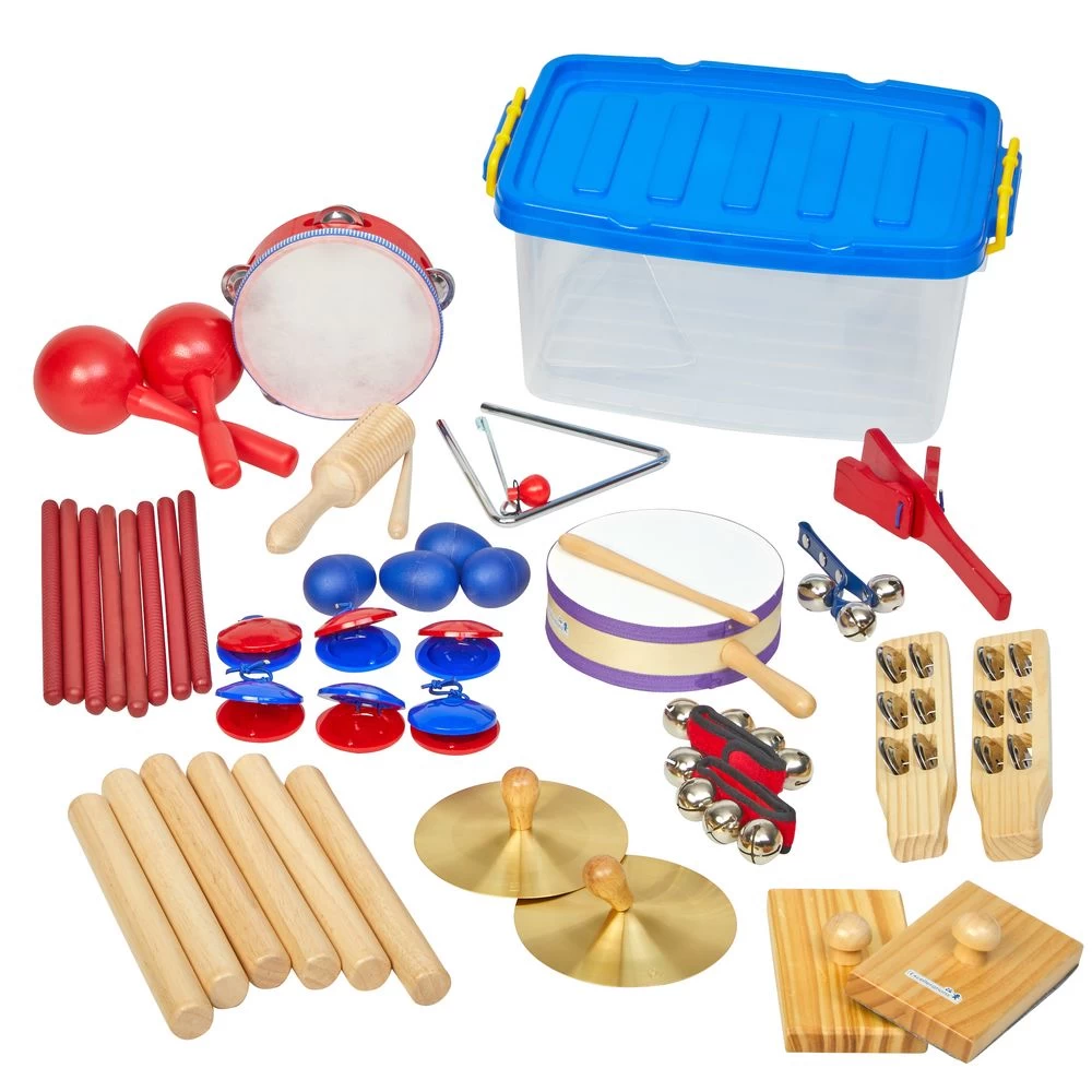 This Rhythm Band is child-tested and approved. Only the most popular instruments were selected to make up this set for child-pleasing fun. Each set will give hours of cooperative play and merry music making. Storage bin included.