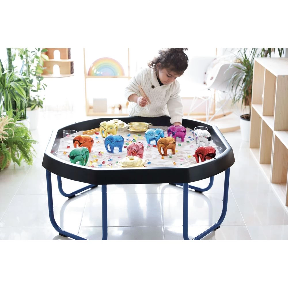 Outdoor stand for an Active World Tray. The stand is adjustable to 4 different heights: 7.5 inches, 11.75 inches, 15.75 inches and 19.5 inches. L 34.25 inches X W 34.35 inches. Ideal for use indoors and outdoors. Made from metal. Colors may vary.