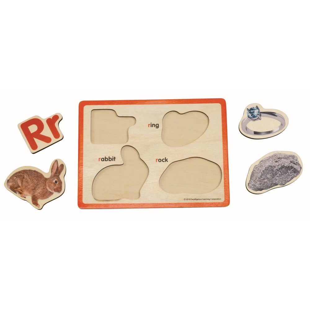 Alphabet puzzle set of 26 puzzles features uppercase and lowercase letters in bright colors. Each puzzle has 4 chunky pieces: 1 piece printed with uppercase and lowercase letters and 3 pieces with photo images of familiar (and some not-so-familiar) objects that represent the corresponding letter. For guidance, the names of images are printed right on the puzzle trays. Heat-transfer printing process and wooden construction are sturdy and durable for years of alphabet learning fun. Puzzle trays measure 6 inches x 8 inches. Pieces measure approximately 2 inches x 2 inches. For children ages 3 years and older.