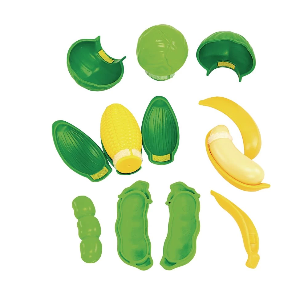 - SET INCLUDES: 35-piece fruit and vegetable playset includes: a banana, peach, orange, pineapple, ear of corn, lettuce, peas in a pod, onion and a head of cauliflower.