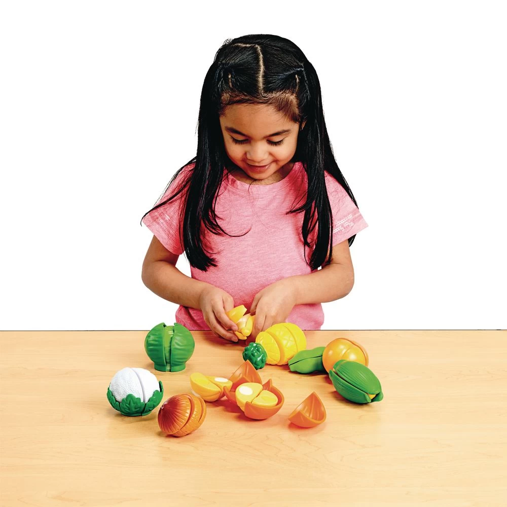 Ideal for use in preschool, daycare, classroom or home use. The cut and play food set of 35 pieces includes: banana, peach, orange, pineapple, ear of corn, lettuce, peas in a pod, onion and a head of cauliflower. Give as a gift for boys or girls. Excellerations offers a wide variety of developmentally appropriate, high quality, value priced educational teaching tools and toys for the early education market.