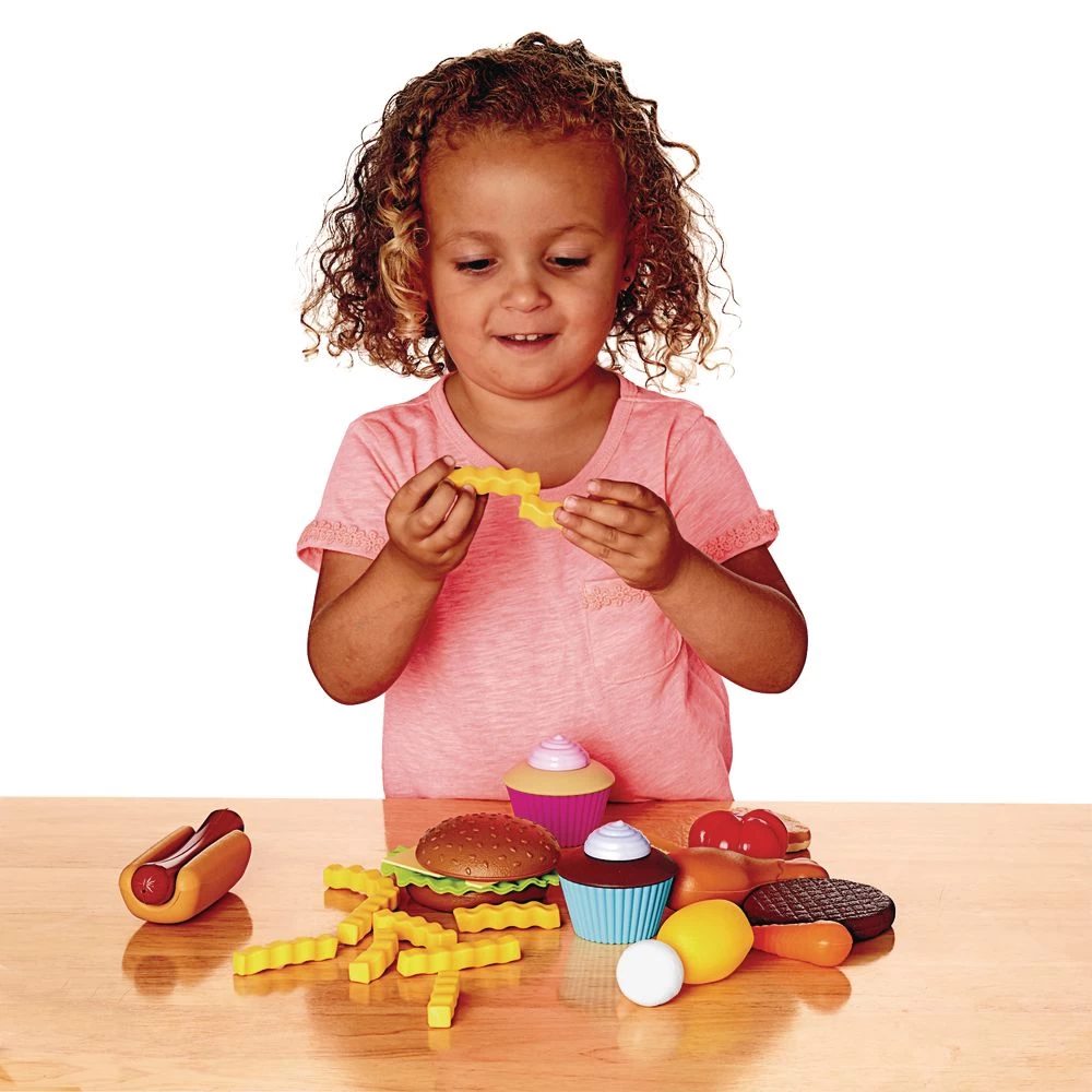 - ROLE PLAY: Play food sets encourage role play and inclusion. The food set is the perfect play kitchen accessory for career exploration and exploring the different food groups. Set includes salad and sandwich ingredients, fruits, vegetables including corn on the cob, barbeque favorites and desserts.