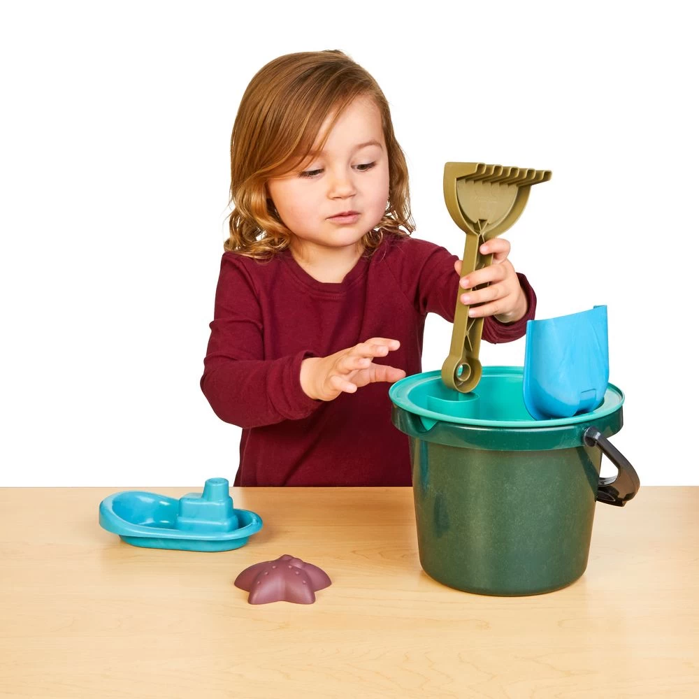- ASSORTED SET: This beach set includes a bucket, a sieve, which also serves as the bucket’s lid, a shovel, a rake, and a sand mold in a cute animal motif. All parts come in subdued natural colors inspired by Danish design.