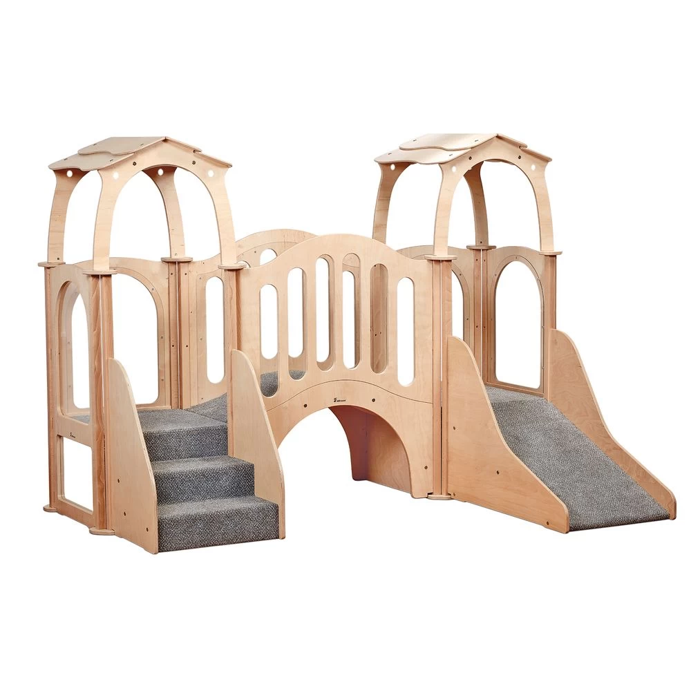 Kinder Gym is the perfect addition to any baby or toddler room. Not only are there a variety of configurations to choose from, but each one incorporates various safety features such as clear plastic panels on the reverse of the guard rails. All units are made from sturdy birch plywood and solid hardwood. An easy-clean, heavy-duty grade carpet, provides a tactile surface for babies and toddlers to crawl, climb and explore. Units are delivered partly assembled and are quick and easy to construct.