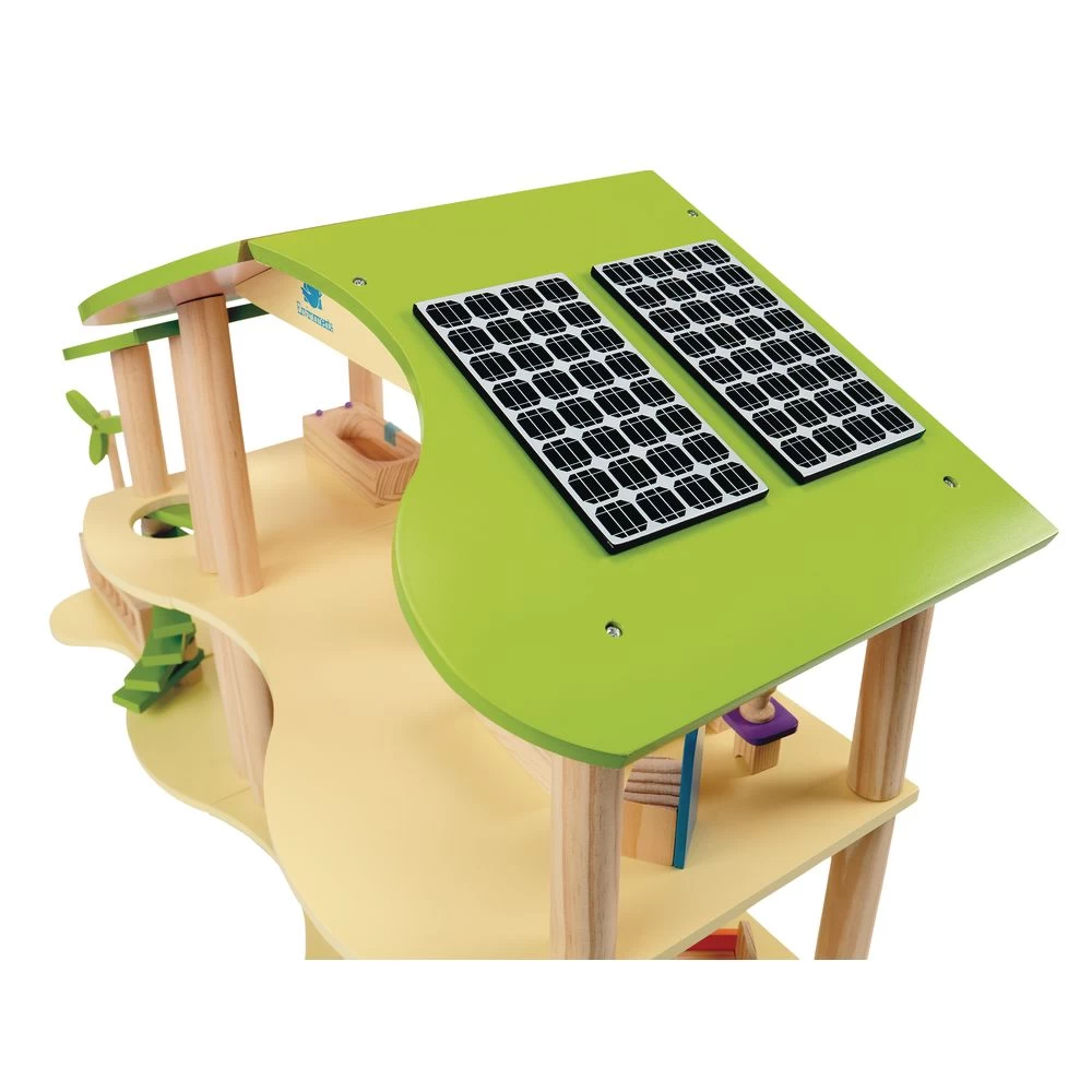 A modern design featuring energy efficient solar panels and a wind turbine! Multiple children can play at once with easy access on all sides and 2 levels of spacious rooms. Wooden with contemporary colors.