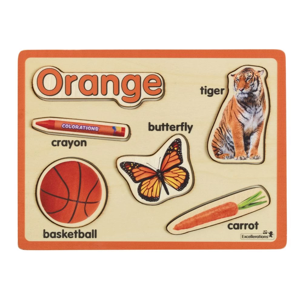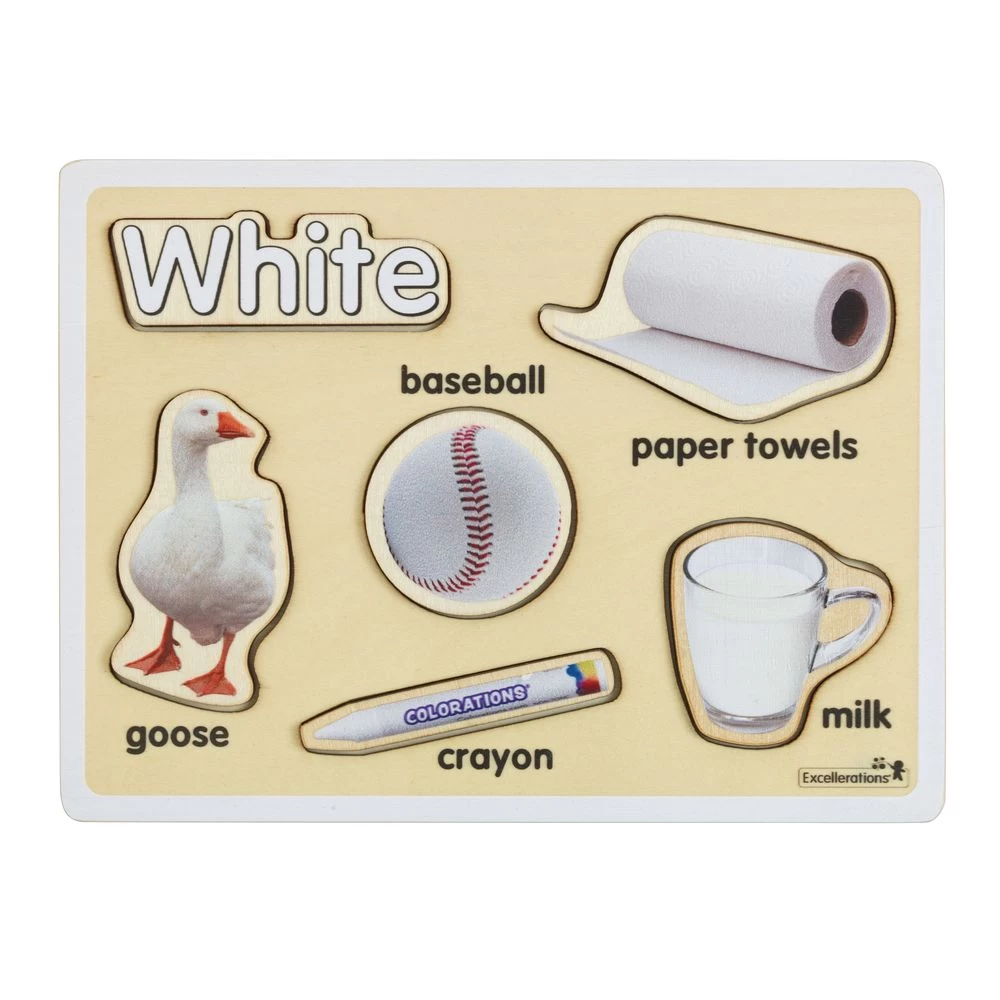This set of eight puzzles is perfect for young learners. Their photo-real pictures ensure that the pictures are easily recognizable. The colors featured are red, orange, yellow, green, blue, purple, black, and white. They are wooden and finished with a coating to ensure that they will last through lots of interaction and play. They feature five images and the color word as the puzzle pieces. Each puzzle base has a colored border so that children know which color they are working with. The base also includes the word of the item so that children understand that objects have words associated with them.