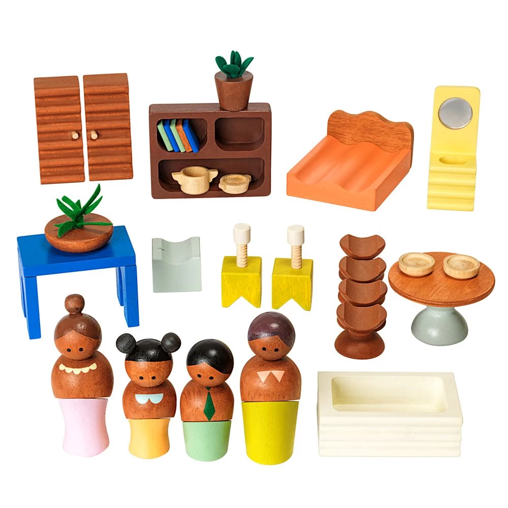 - STURDY DESIGN: This modern dollhouse measures 9-1/2″W x 10-2/5″L x 19-1/10″H and is crafted from sustainably harvested rubberwood. The toys are painted using only quality non-toxic finishes. Doll family of 4, furniture, and accessories are also included. Assembly required.