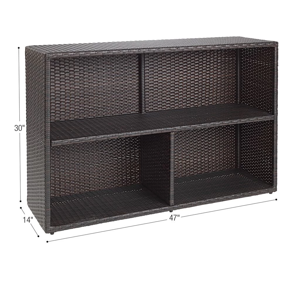 Organize your space with the versatile, three cubby outdoor wicker Storage Shelf. New configuration of the shelves allows for flexibility in storing a variety of sized objects. Available in a neutral colorway, the Wicker Storage Shelf is an attractive storage piece and makes a lovely addition to any decor, inside or out.