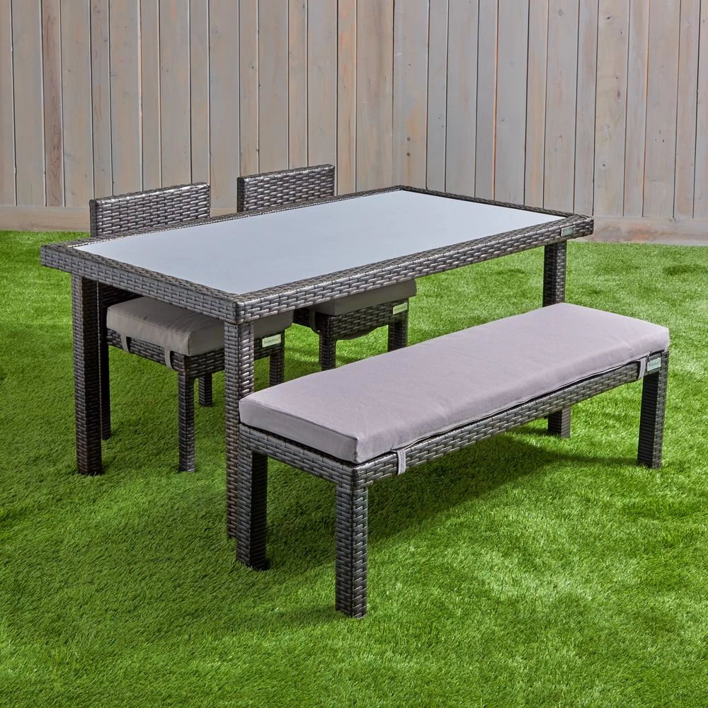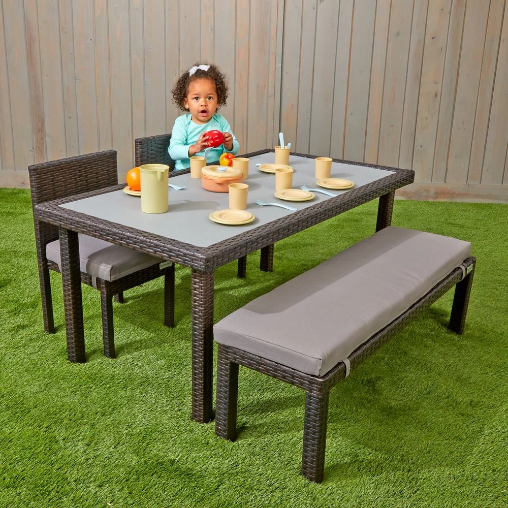 - OUTDOOR DINING IN STYLE: Table, bench, and chairs have classic yet contemporary look that’s attractive and practical – perfect for outdoor dining on the deck or patio or for nature-inspired classrooms. Lightweight aluminum frames are wrapped with wicker-look plastic strips in variegated shades of browns and grays that look and feel like real wicker. A high density polyethylene (HDPE) tabletop is framed by resin wicker edges creating a timeless look