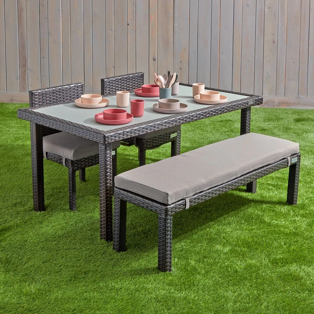Attractive wicker-look dining set for indoor or outdoor use has classic yet contemporary look that enhances any decor. Lightweight aluminum frames are wrapped with variegated plastic strips that look and feel like real wicker, but really hold up to weather – just wipe clean. Bench and chair have thick foam cushions with sun-resistant fabric cover; tabletop is made of solid eucalyptus wood slats that weather to a beautiful silver-gray. Sold in multiple configurations for ordering ease.