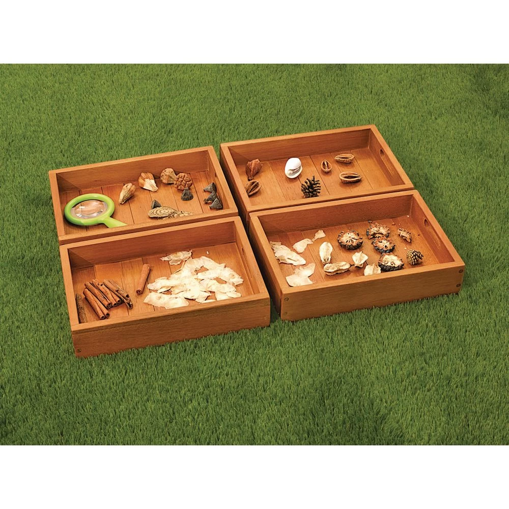 These trays are built to last! Set of 4 trays are made from eucalyptus wood and designed for use outdoors. Gather feathers, leaves, and more to explore the great outdoors. Sorting trays measures 14 inches long x 9.5 inches wide x 2 inches deep. Made from durable eucalyptus wood that doesn’t need to be treated and naturally weathers over time. Ships fully assembled. For children ages 3 years and older.