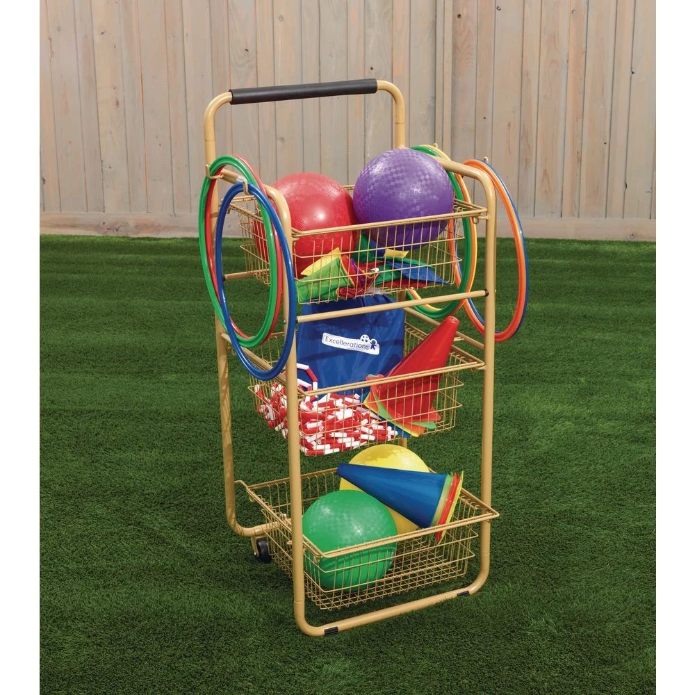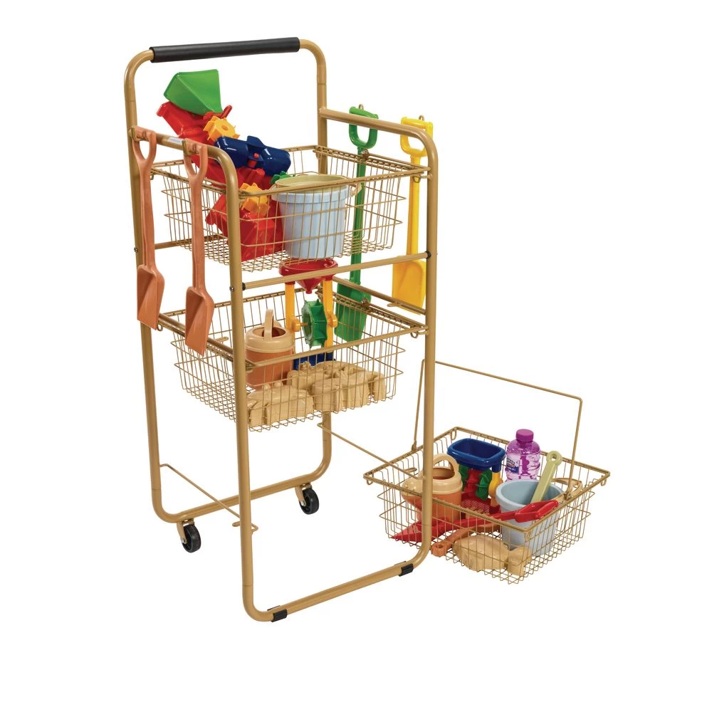 Compact, versatile storage for lightweight toys – only 18.5 inches x 15.75 inches x 43 inches high. Three removable baskets hold a variety of sand and water or active play items, handy hooks for hanging jump ropes and hoops. Unique tip-proof design allows cart to be pushed or pulled on easy-glide casters. Wire mesh baskets stay securely in place but are simple to remove and carry to any learning area. Simple assembly – illustrated, step-by-step instruction sheet; all hardware and tools included. Easy clean with mild solution, or simply hose down and let drip dry.