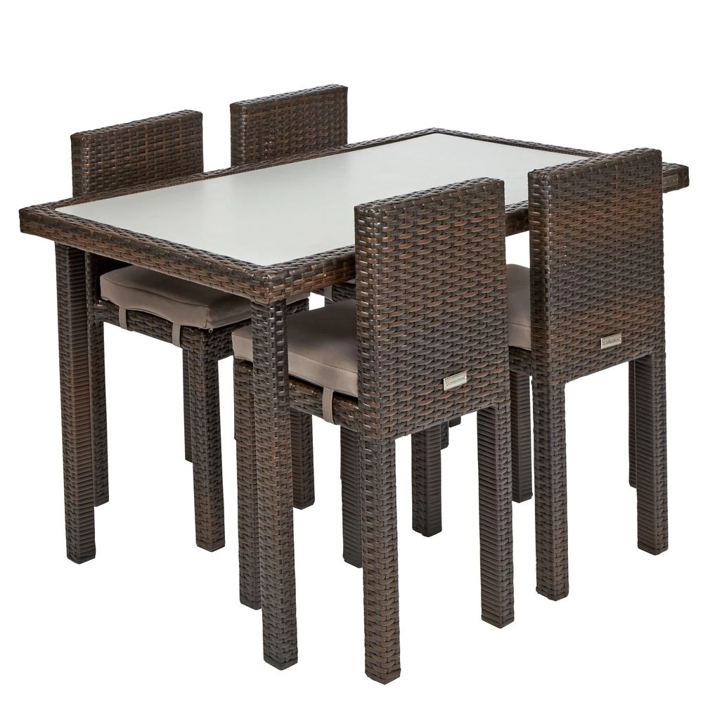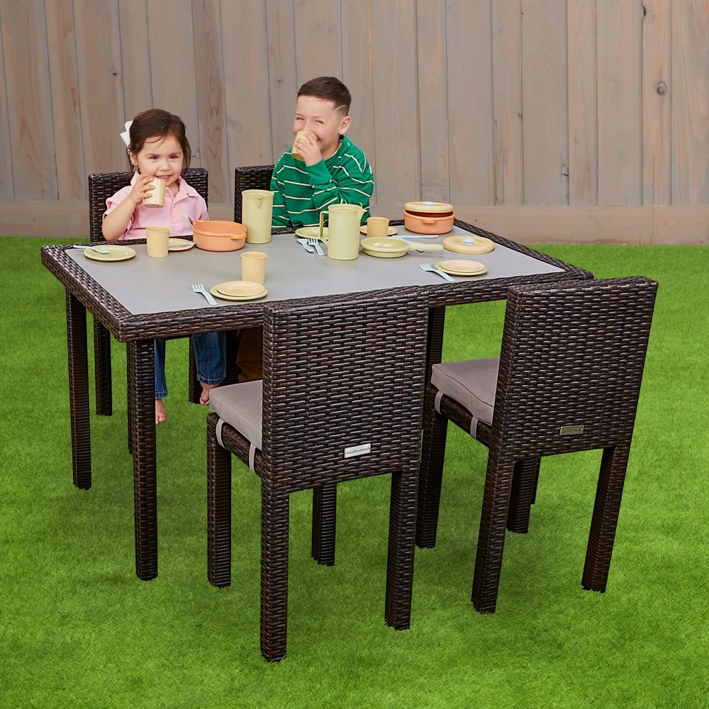 Enhance your outdoor learning space with this classic looking table and 4 chair set. All-weather construction withstands the elements as well as drinks and snacks. Clean lines and neutral palette complements any decor. Perfect learning or dining space. Chairs are a classic yet contemporary design with clean lines and neutral palette that complements any decor. Chair has thick foam cushion with sun-resistant fabric cover. Recommended for 5 years and Up.