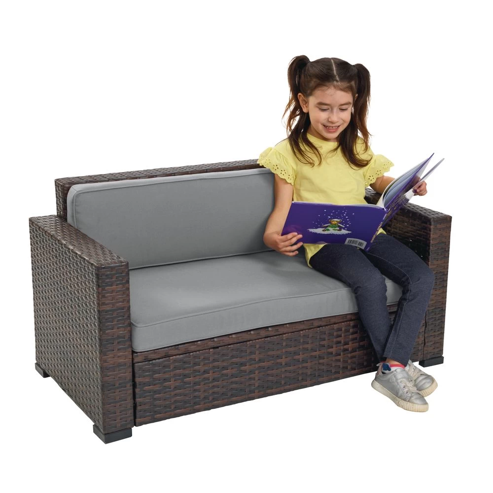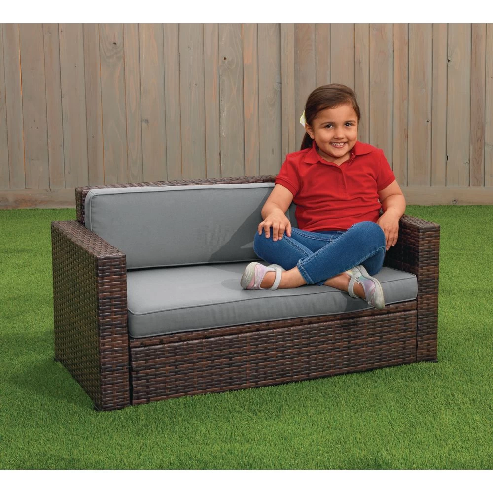 - CONTEMPORARY DESIGN: Clean lines are swathed with wicker-look strands in shades of tan, brown, beige, and gray. Looks and feels like real wicker, complements any decor. Sofa measures 39 inches x 20 inches x 21 inches with 8.5-inch seat height – perfect for preschoolers.