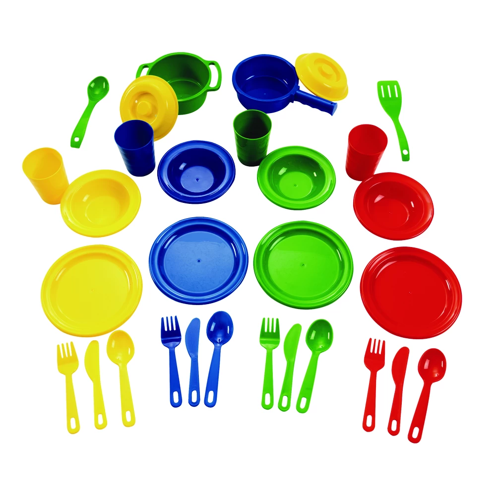 Dishes are sturdy enough to withstand years of play! Bright and durable starter set of dishes for toddlers is made of heavy-duty plastic. Plates are 6-1/2″Dia. Colors vary.