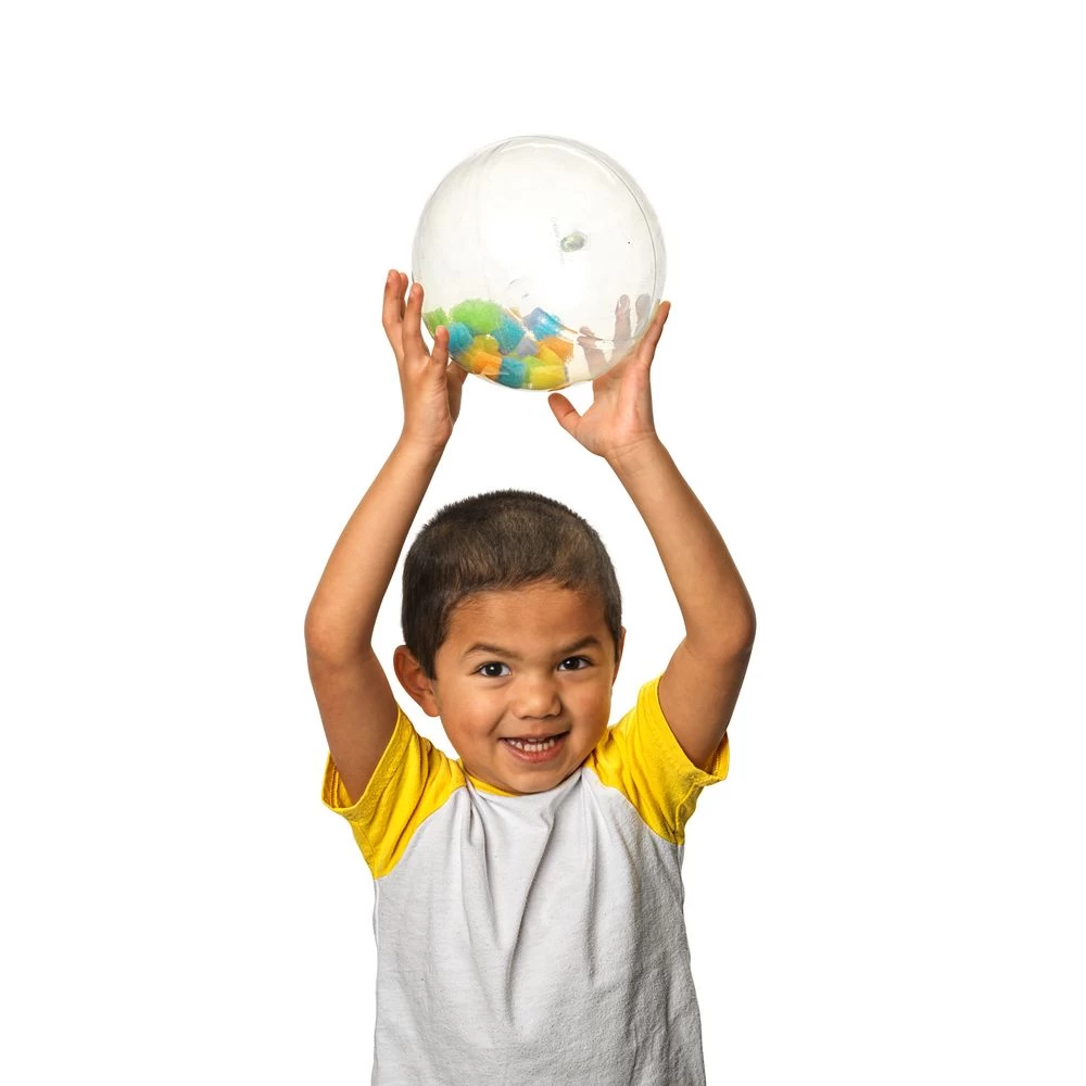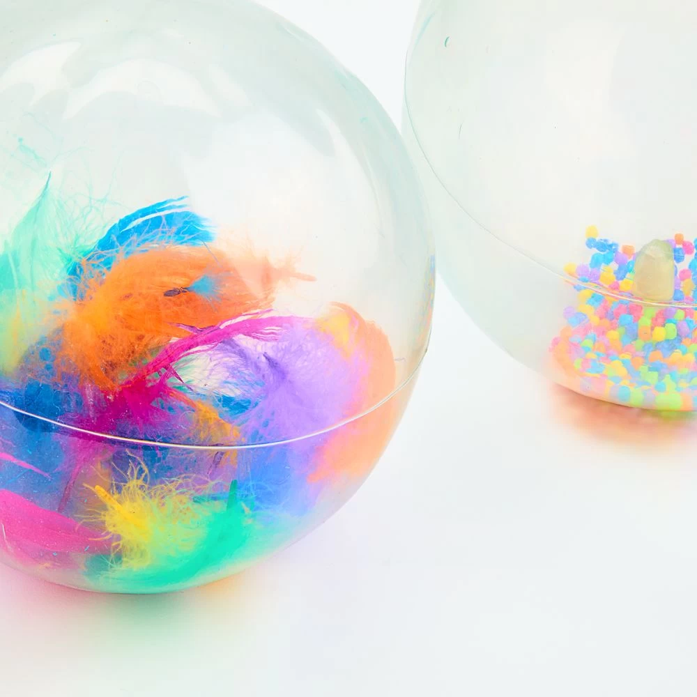 - EXCITE THE SENSES: Each see-inside ball has unique sensory fill which will be sure to excite any child’s senses. Included are sponge pieces, plastic straw pieces, plastic beads, and feathers.