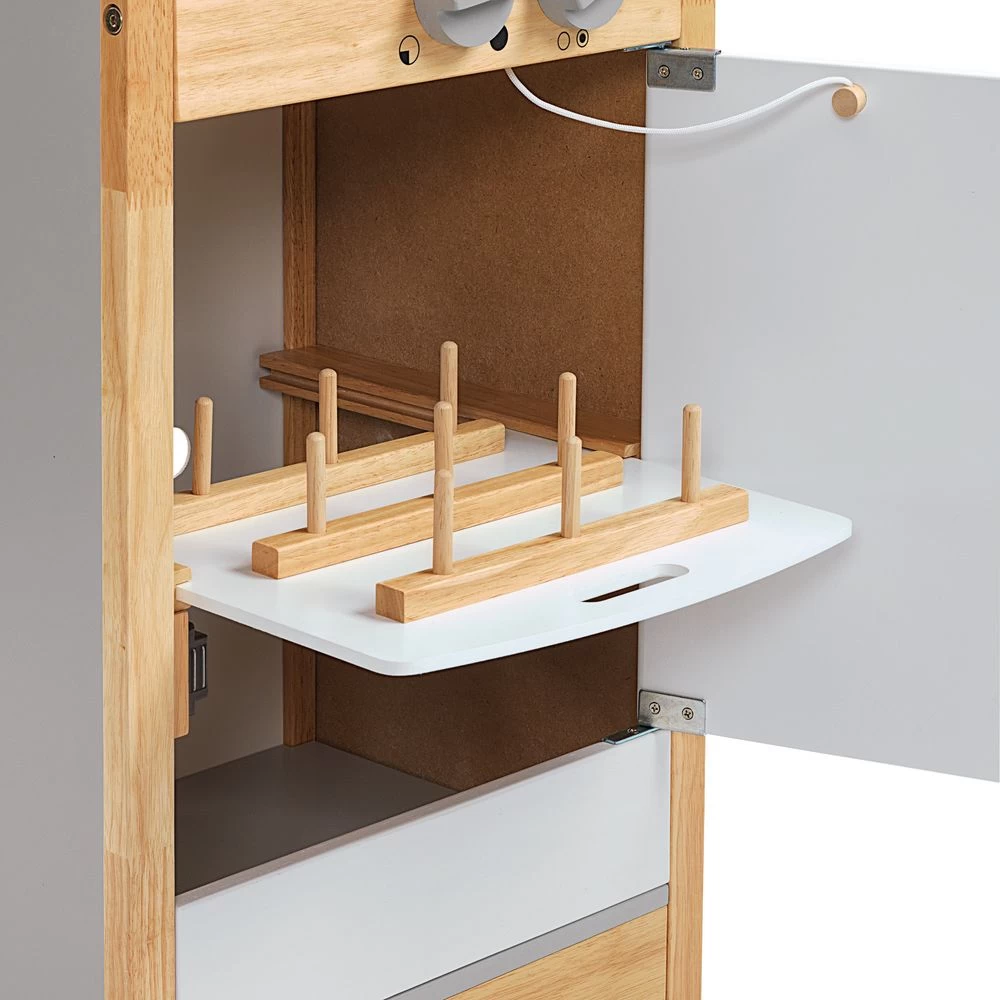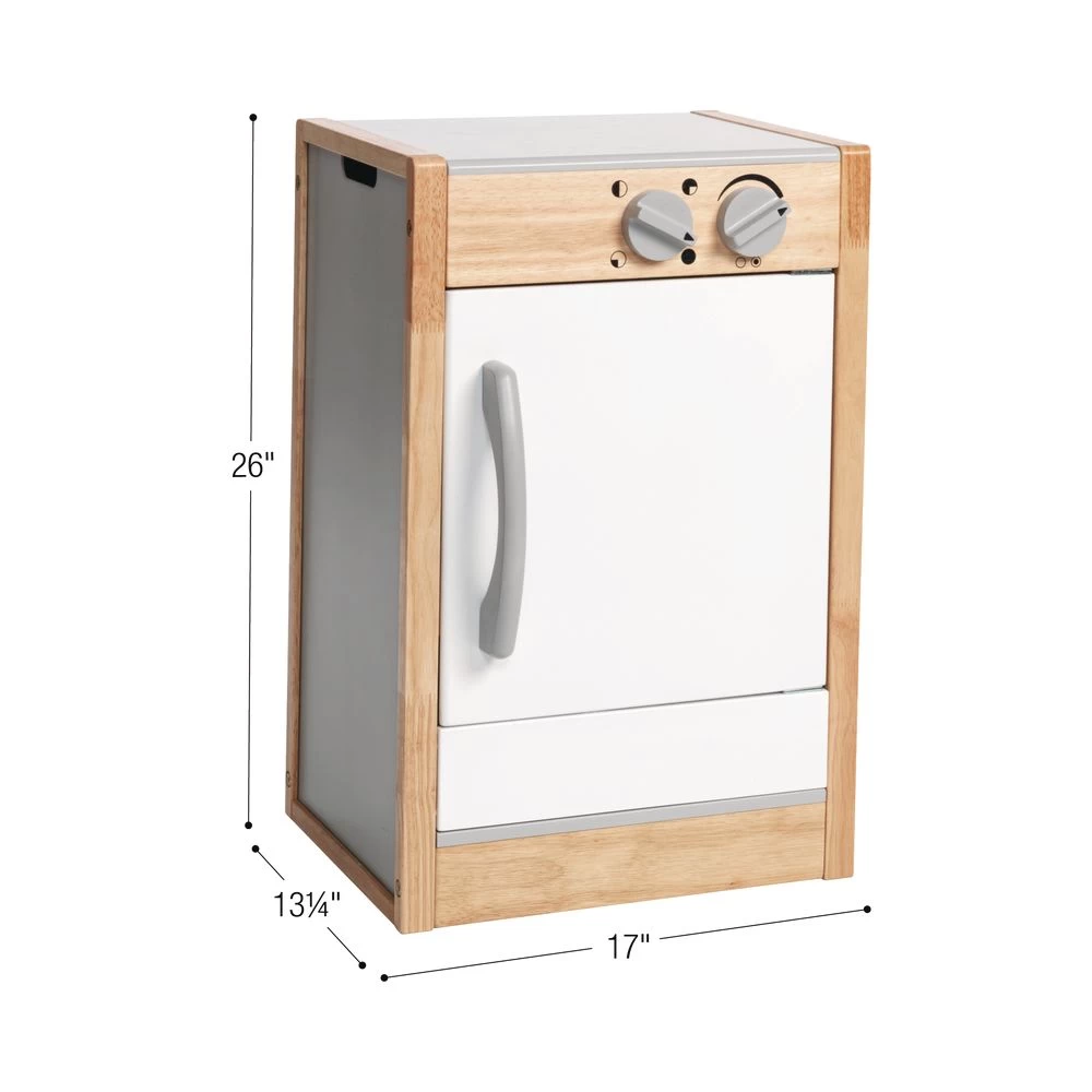 - STURDY DESIGN: This durable dishwasher measures 13-1/4 x 17 x 26 inches and is crafted from sustainably harvested rubberwood. The toys are painted using only quality non-toxic finishes. The dishwasher can be wiped clean with a damp cloth. The unit also features rounded corners for safety.