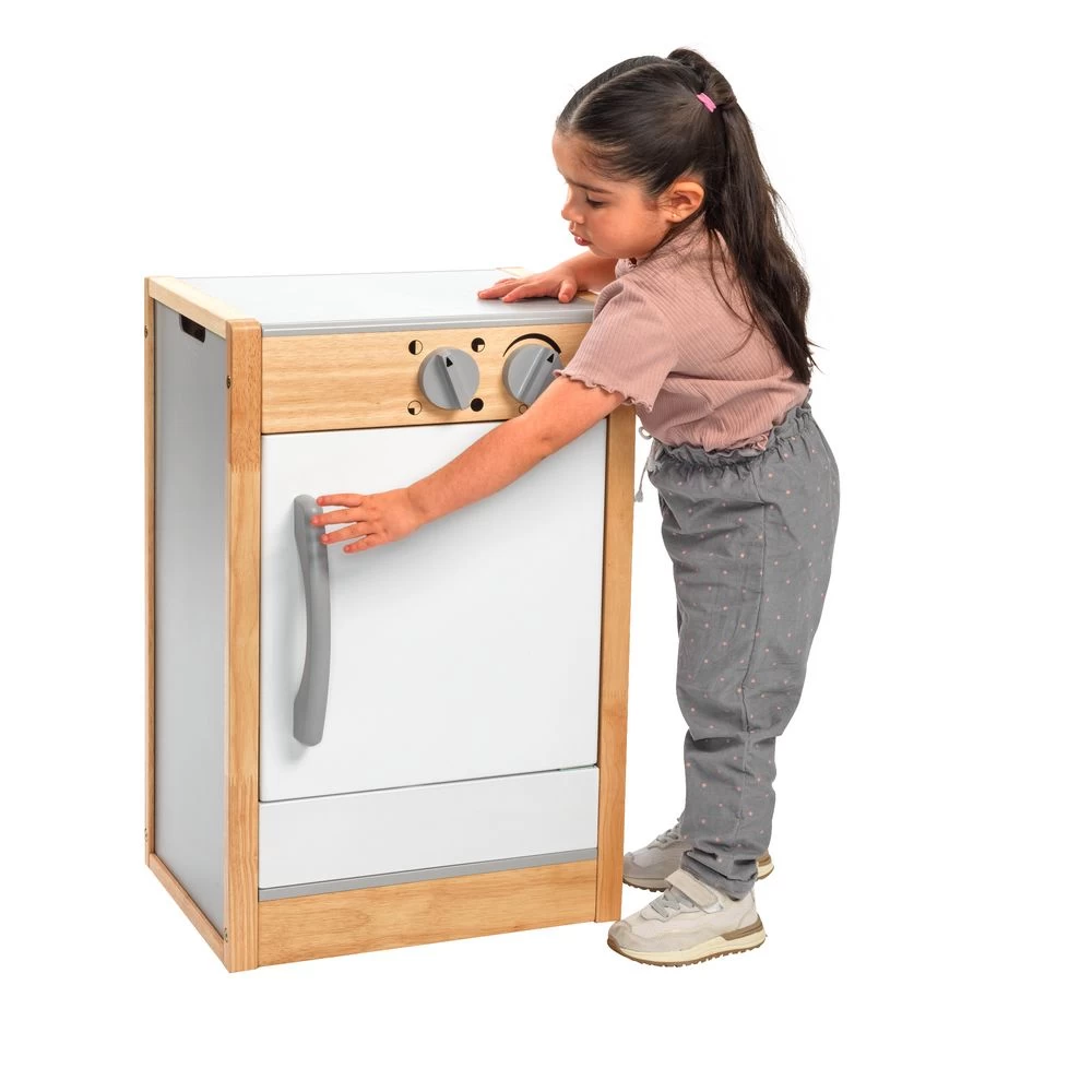 This modern dishwasher will provide years of imaginative play for young children. The child-sized design features an oversized door handle that opens to a sliding easy-load tray. Children can load the dishwasher and pretend to do the dishes just like grown-ups! Recommended for ages 36 months and up.