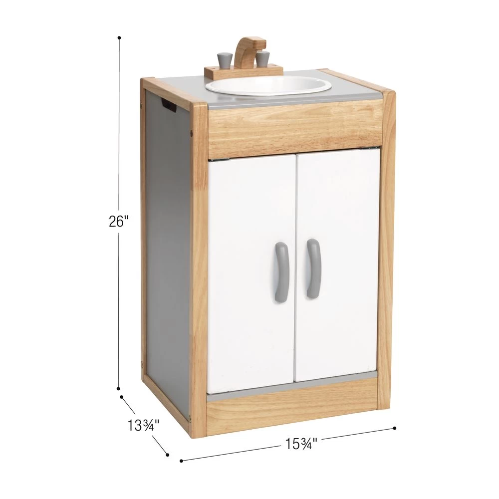 - STURDY DESIGN: This durable sink measures 15-3/4 x 13-3/4 x 26 inches and is crafted from sustainably harvested rubberwood. The toys are painted using only quality non-toxic finishes. The sink can be wiped clean with a damp cloth. The unit features rounded corners for safety.