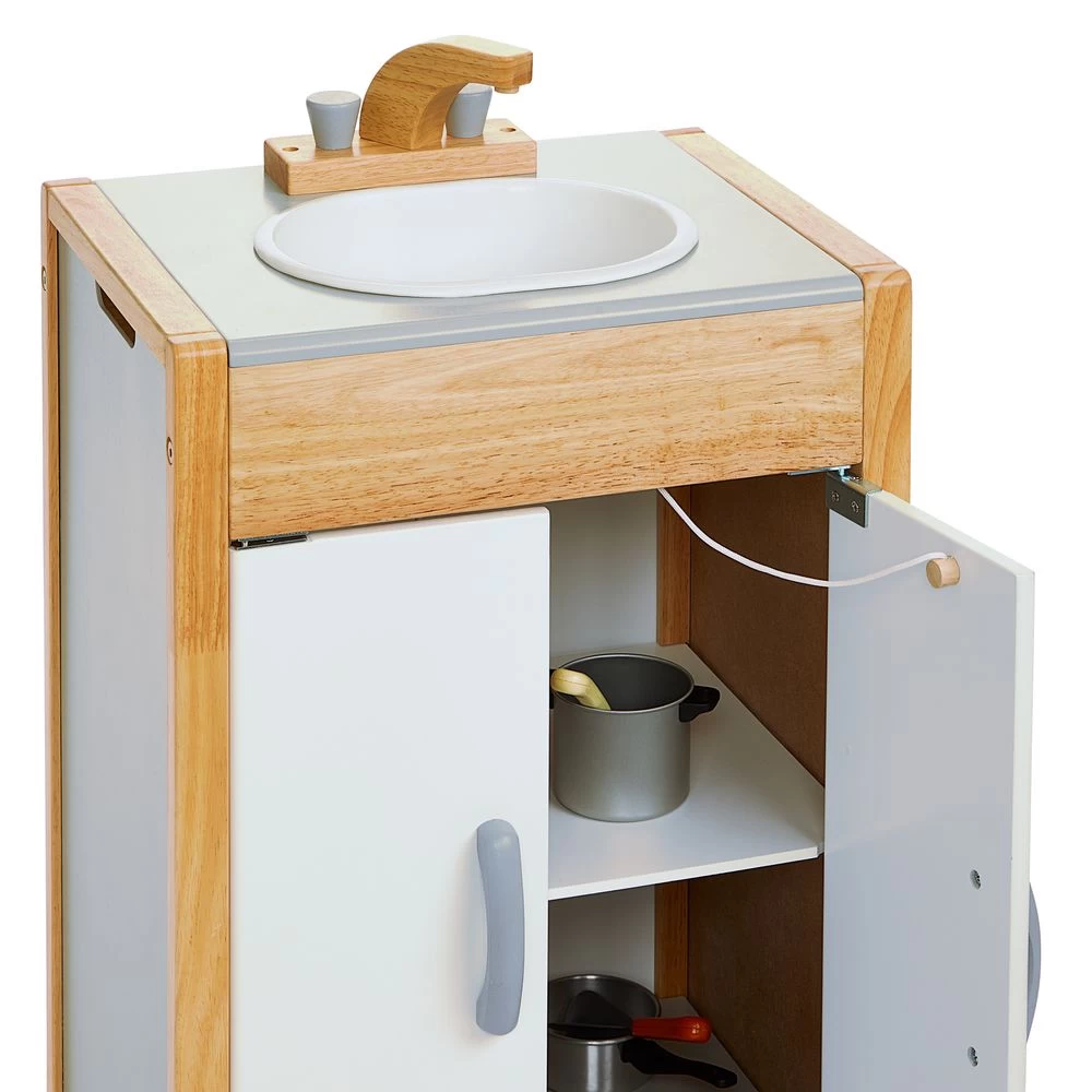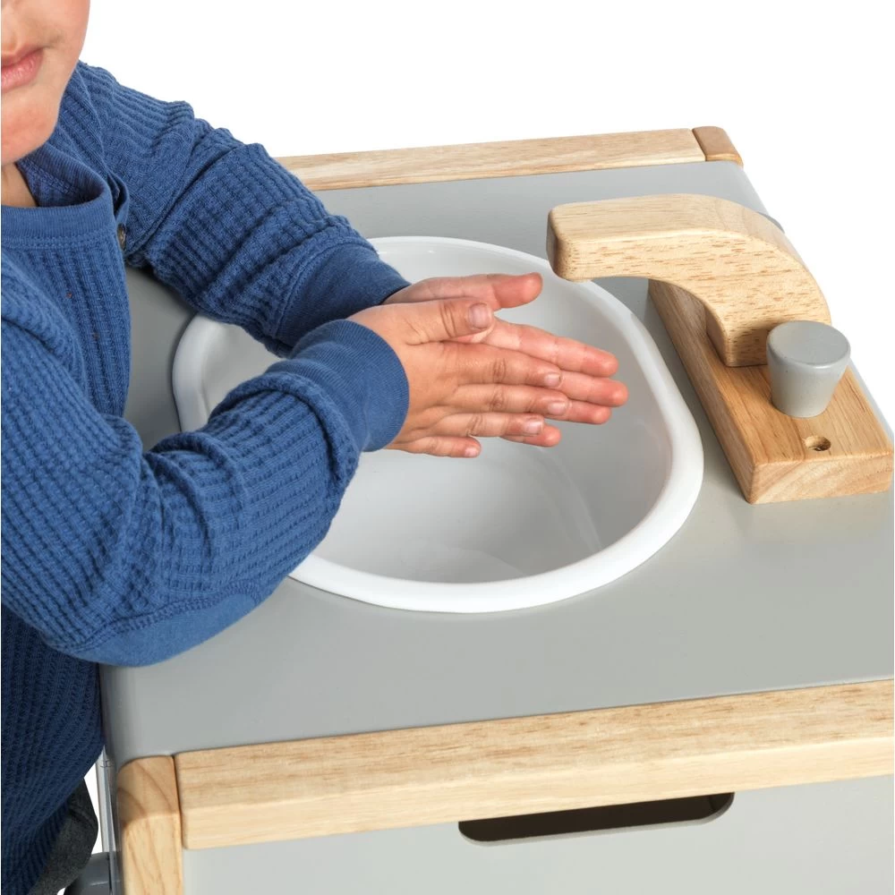 This modern sink in grey will provide years of imaginative play for young children. The unit also includes a removable plastic sink basin and a large storage compartment with shelf. Some assembly required. Recommended for ages 36 months and up.