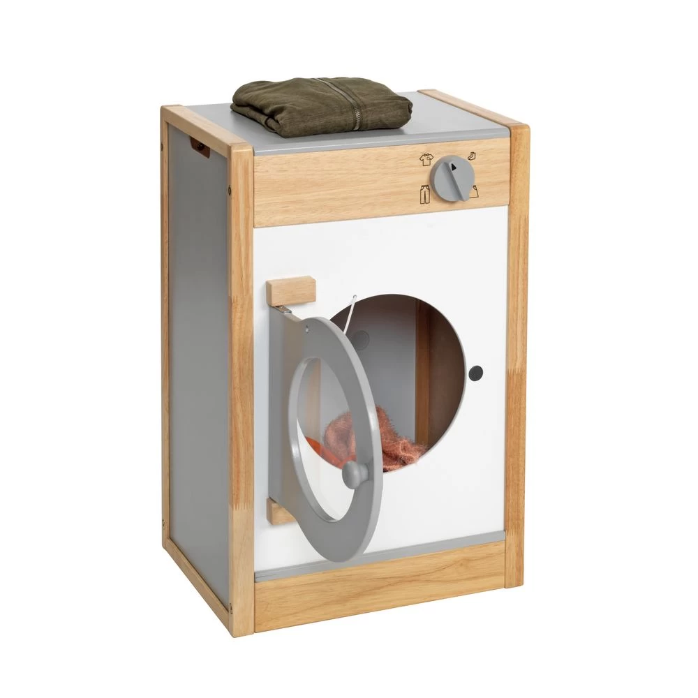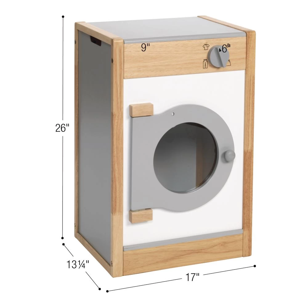 - STURDY DESIGN: This durable washer measures 13-1/4 x 17 x 26 inches and is crafted from sustainably harvested rubberwood. The toys are painted using only quality non-toxic finishes. The washer can be wiped clean with a damp cloth.