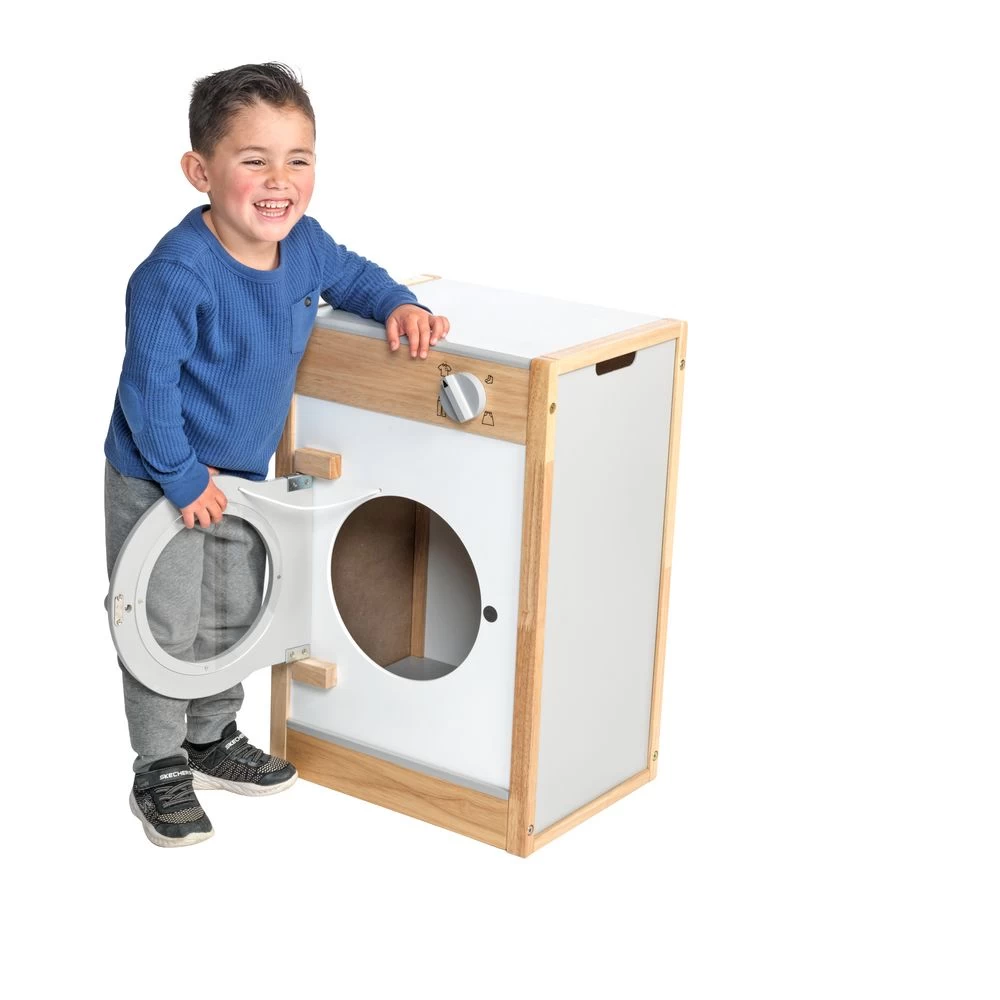 This modern washer will provide years of imaginative play for young children. The front-loading design features a see-through door that opens and closes. A chunky setting knob is movable for little hands to turn. This durable unit also includes plenty of roomy space inside the washing compartment so kids can pretend to do the laundry just like grown-ups! Recommended for ages 36 months and up.