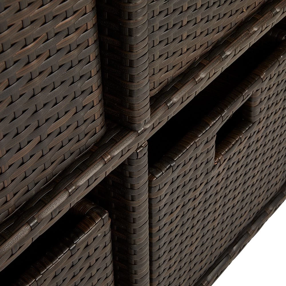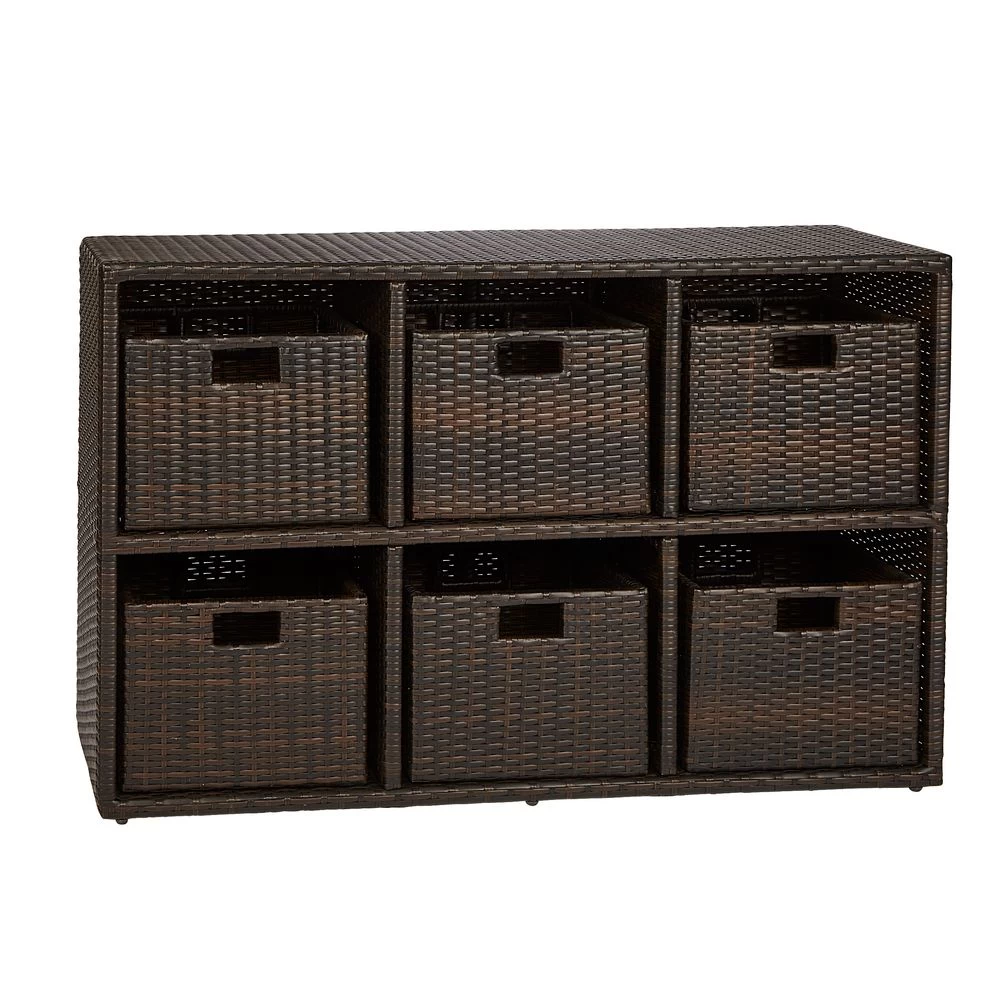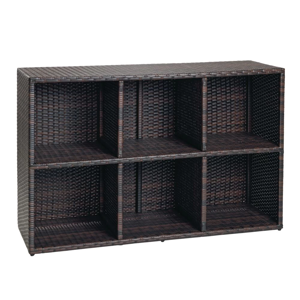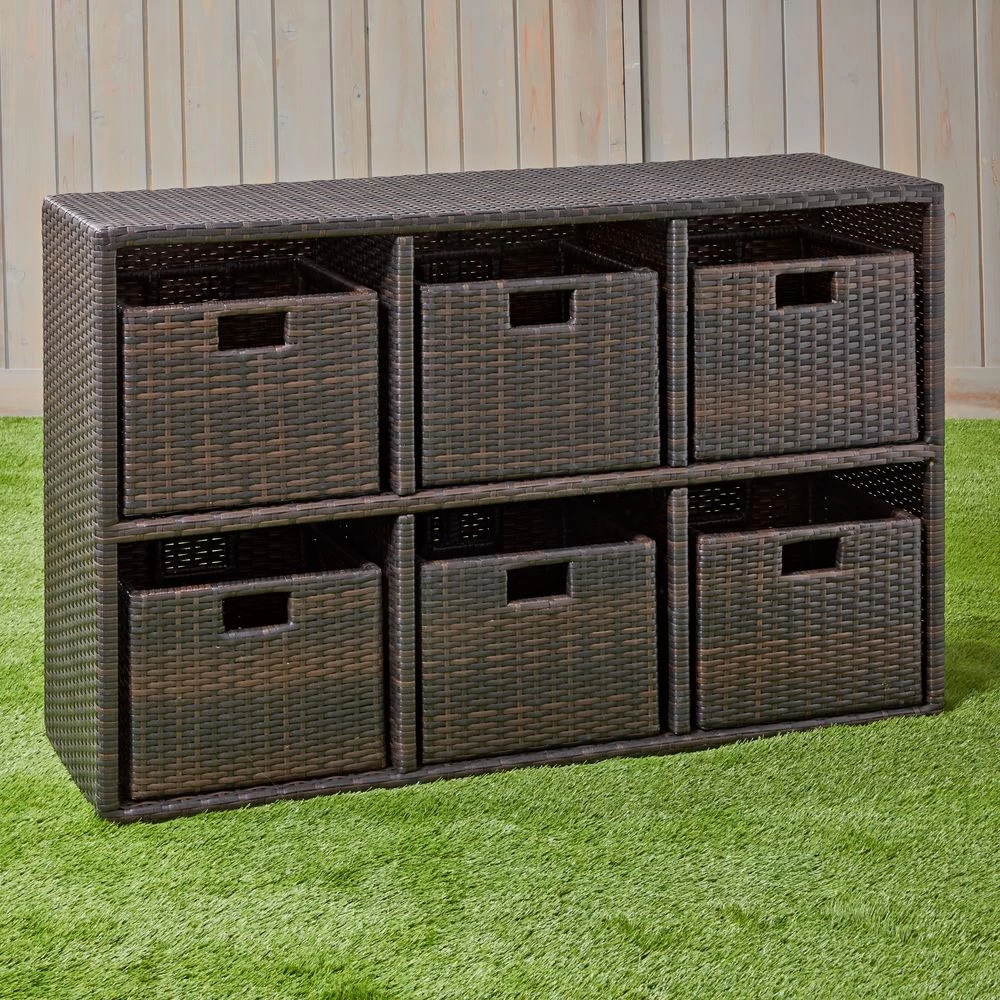 Store toys, games, supplies and more or use the six spacious cubbies with six baskets. Ideal storage solution indoors or outdoors – perfect for nature-inspired classroom, outdoor learning areas, or at home on a deck or patio. Lightweight aluminum frame is wrapped in wicker-look plastic strips in variegated neutral palette that complements any decor. Unit measures 47″ x 15″ x 30″ high weighs 33 pounds. Each cubby measures 14-1/2″ x 15″ x 13.5″. No assembly needed.