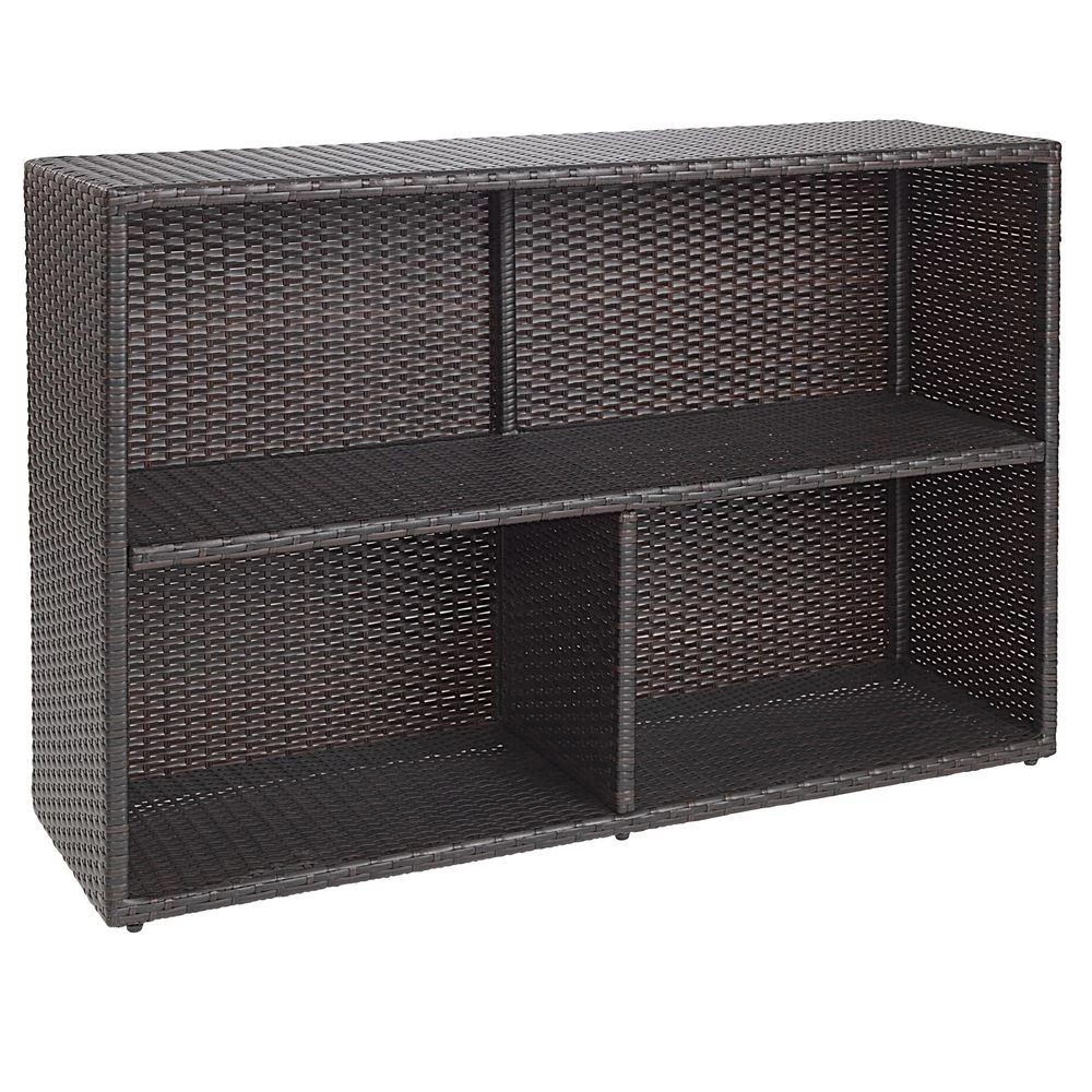 Organize your space with the versatile, three cubby outdoor wicker Storage Shelf and 2 outdoor wicker baskets. New configuration of the shelves allows for flexibility in storing a variety of sized objects. Available in a neutral colorway, the Wicker Storage Shelf is an attractive storage piece and makes a lovely addition to any decor, inside or out. Keep things close at hand, yet hidden, by stowing books, toys and more inside the durable wicker baskets.