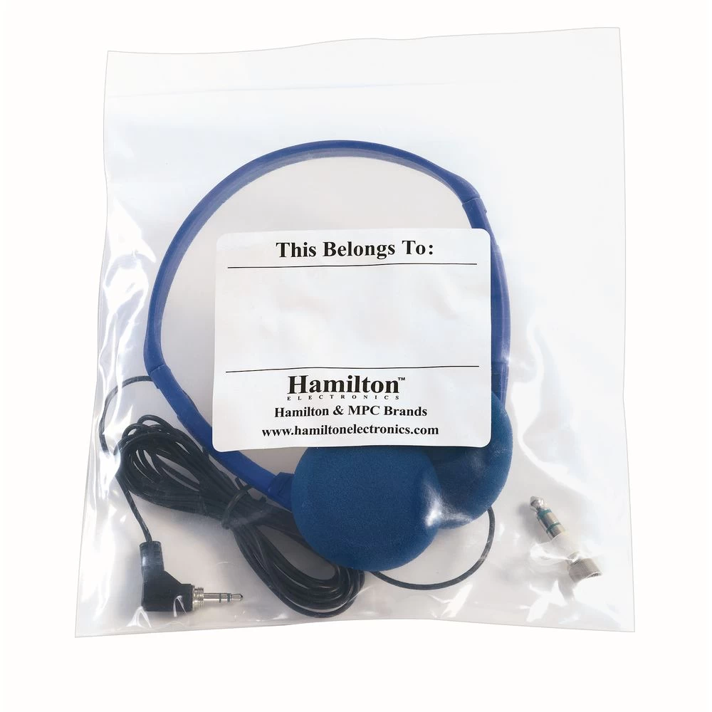 Pair this kid-size set of 6 blue headphones with the Hamilton™ Digital Audio Hub. Designed to combat the spread of head lice in schools. Each headphone comes in its own heavy-duty, write-on, re-sealable bag. When sealed in the bag, lice expire in 24-48 hours without the use of chemicals. Includes 1/8″ plug.