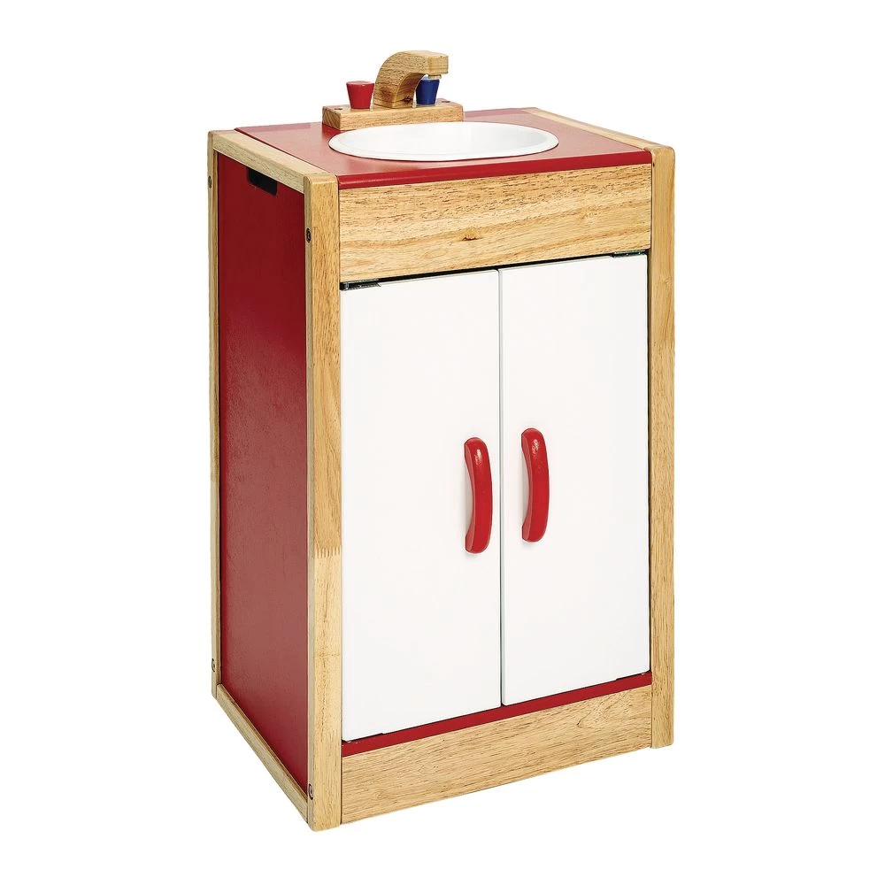 - Features a removable plastic sink basin and hot and cold moveable faucet knobs