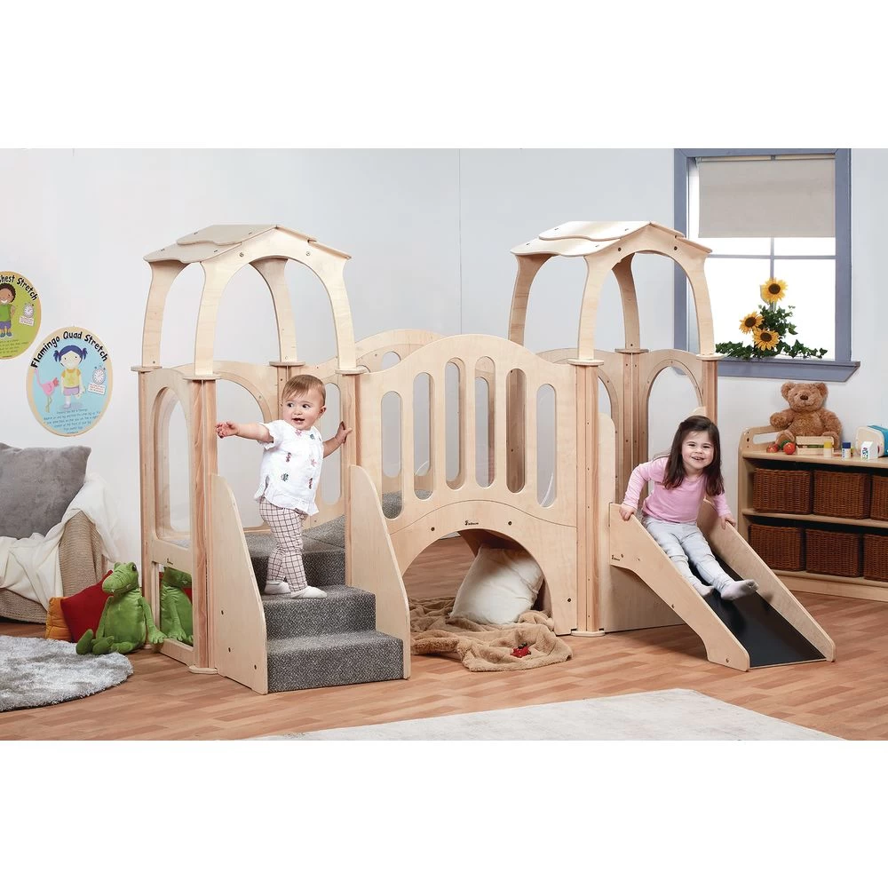 Kinder Gym is the perfect addition to any baby or toddler room. Not only are there a variety of configurations to choose from, but each one incorporates various safety features such as clear plastic panels on the reverse of the guard rails. All units are made from sturdy birch plywood and solid hardwood. An easy-clean, heavy-duty grade carpet, provides a tactile surface for babies and toddlers to crawl, climb and explore. Units are delivered partly assembled and are quick and easy to construct.