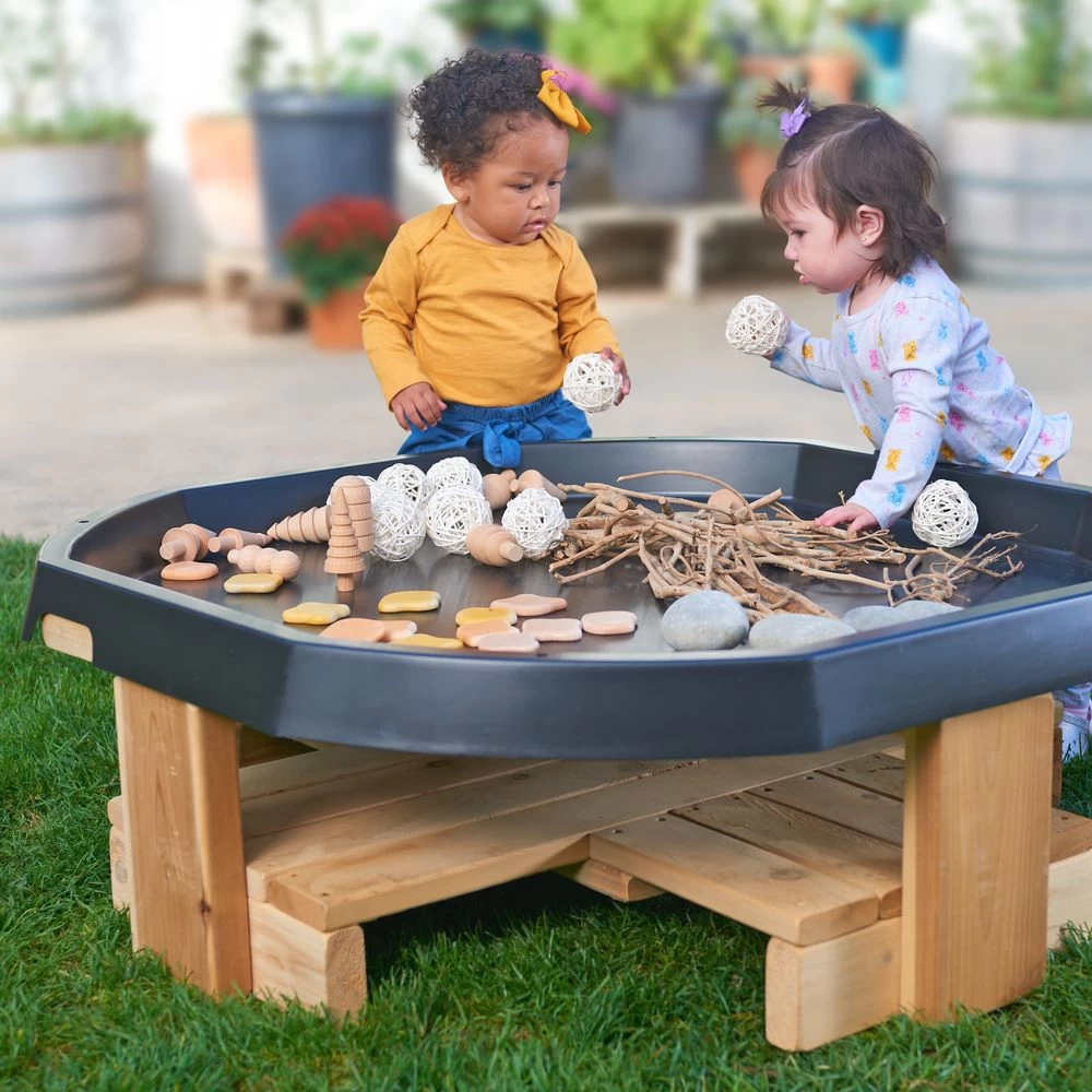 Attractive alternative to a metal stand, with a natural, rustic finish. This unit includes a shelf, with 5sq. ft. of handy space for locating resources whilst in use. Made from Western Red Cedar this unit is attractive enough to be used inside yet designed for the rigors of the outside. This stand is light and easy to relocate throughout your outdoor play area.