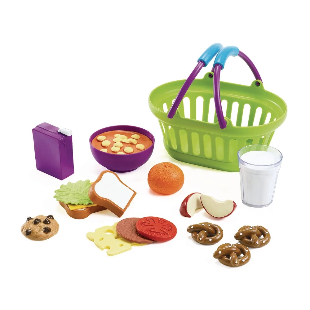 - Includes a glass of milk, juice box, soup in bowl, 3 mini pretzels, clementine, lettuce slice, tomato slice, 2 slices of bread, cheese slice, salami slice, Swiss cheese slice, cookie and 2 apple slices