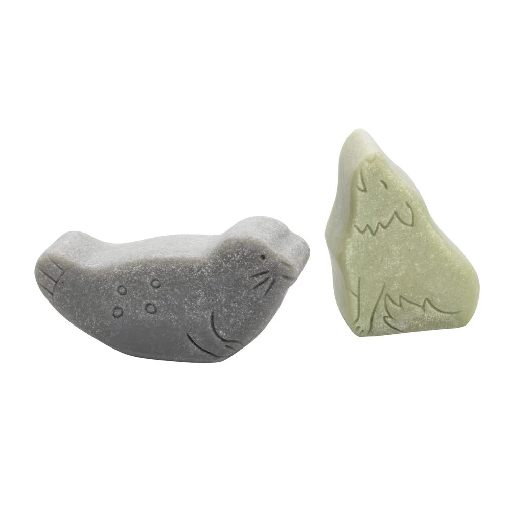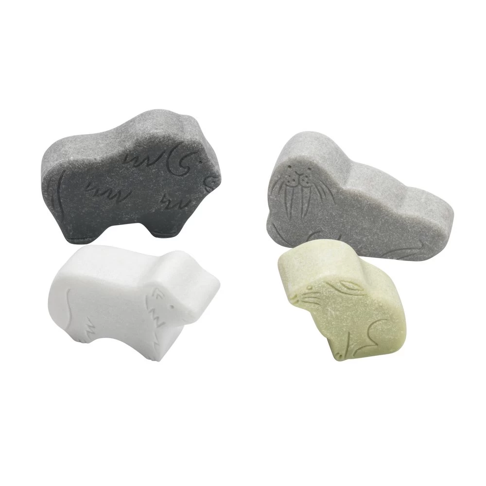 From bear to hare we have your polar expeditions and storytelling covered! The appealing animal figures in this set are perfect for icy, imaginative small world play. Created using a durable stone mix, these tactile animals are tough enough to be used outdoors and in water, ice, soil or snow. The etched details and natural shades give lots to talk about and explore. The set includes: arctic fox, arctic hare, arctic wolf, musk ox, penguin, polar bear, seal and walrus. Max length 3″.