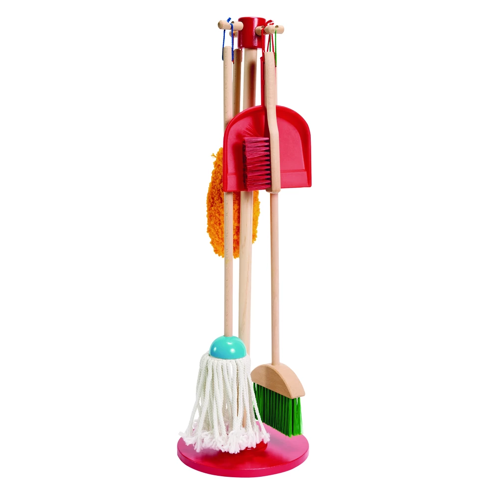 - SWEEPIT: 6-piece play set gives kids all the housekeeping tools they need to keep their play space clean! Sized for kids and built to last, the broom, mop, duster, dust pan and hand brush are comfortable to use and easy to store – just hang them from the sturdy cords onto the stand. Durable natural-wood handles. 28″ x 4-1/2″ x 11″