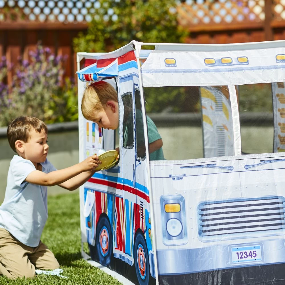 - Roomy and sturdy 4-foot-long food truck indoor or outdoor fabric tent playhouse with vibrant, full-color exterior artwork.