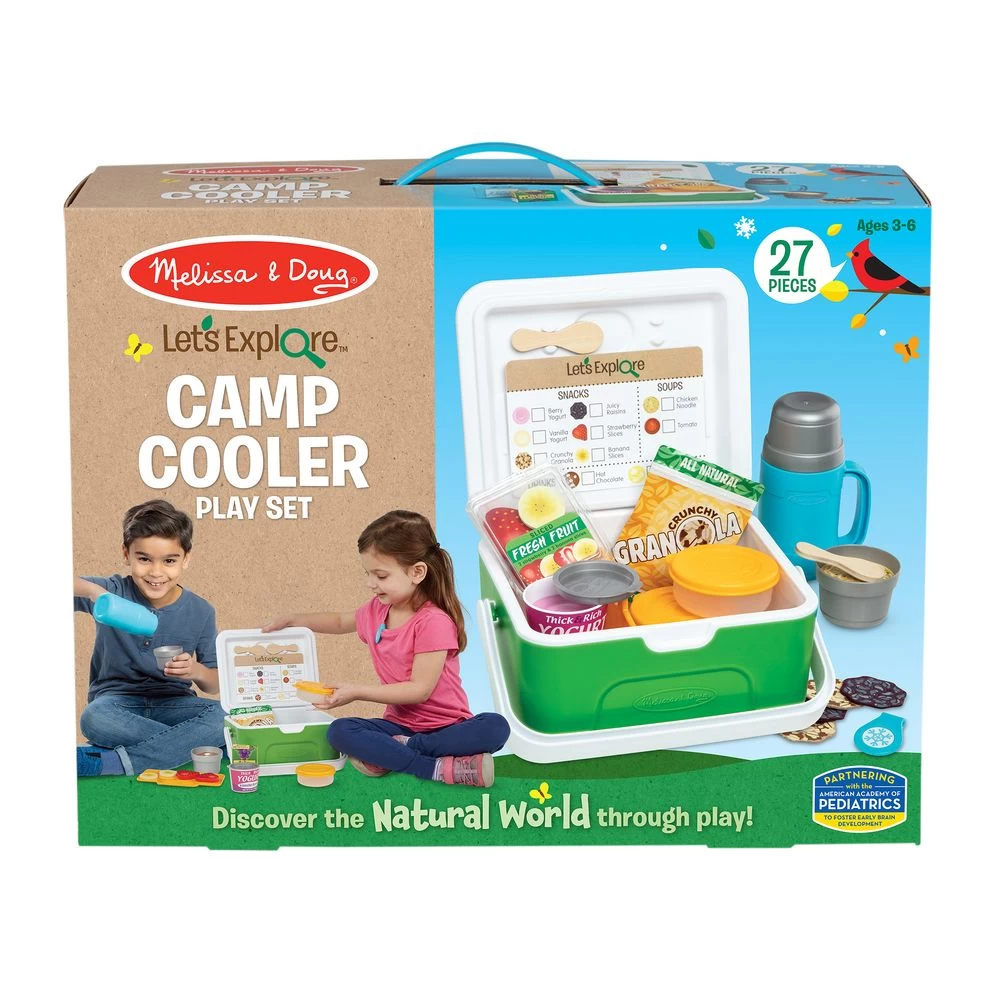 Explore the fun of preparing pretend meals and snacks on imaginative camping trips, picnics, or trips to the beach with the 27-piece Melissa & Doug Let’s Explore™ Camp Cooler Play Set! Load up the kid-sized play cooler with realistic play food packages of granola, raisins, fruit, and yogurt. A play ice pack keeps things “cool,” and there’s a container with two nesting cups for “hot” soup and drinks! Everything stores in the play cooler for quick and easy cleanup. Let’s Explore™ encourages kids three and older to connect with the natural world through imaginative play! Discover the joy of outdoor adventures that instill curiosity and confidence while inspiring kids to say, “Let’s Explore™”!