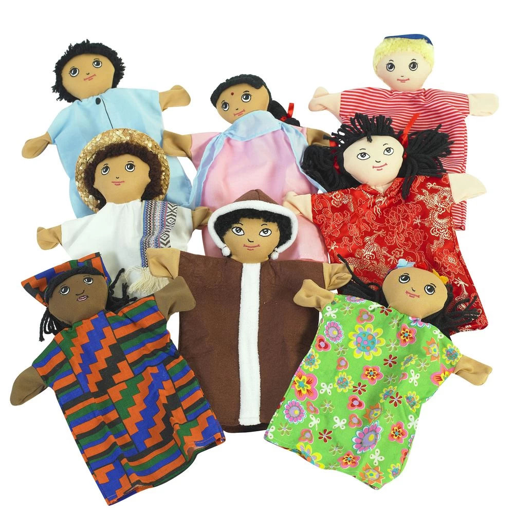 COLORFUL PUPPETS: Puppets are constructed using brightly colored fabrics to bring pretend play to life. Set of 8 puppets: 1 Peruvian boy, 1 Mexican girl, 1 African boy, 1 American girl, 1 Russian boy, 1 Chinese girl, 1 Australian boy, and 1 Japanese girl.