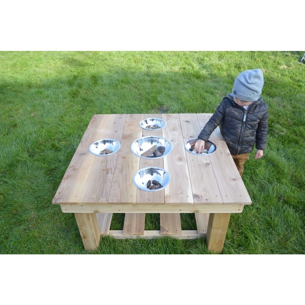 A versatile, sturdy table for experimenting and exploring different materials. Encourage collaborative experimentation with this four-sided activity table. Creativity will soar as children use the different bowls to mix, mash and mold. Featuring 5 metal, removable mixing bowls and a lower shelf for accessory storage. Use as part of a messy play area/collection or as a stand-alone piece. Made of natural North American Cedar which is guaranteed against rot and insect infestation for 5 years and provides excellent resistance to moisture.