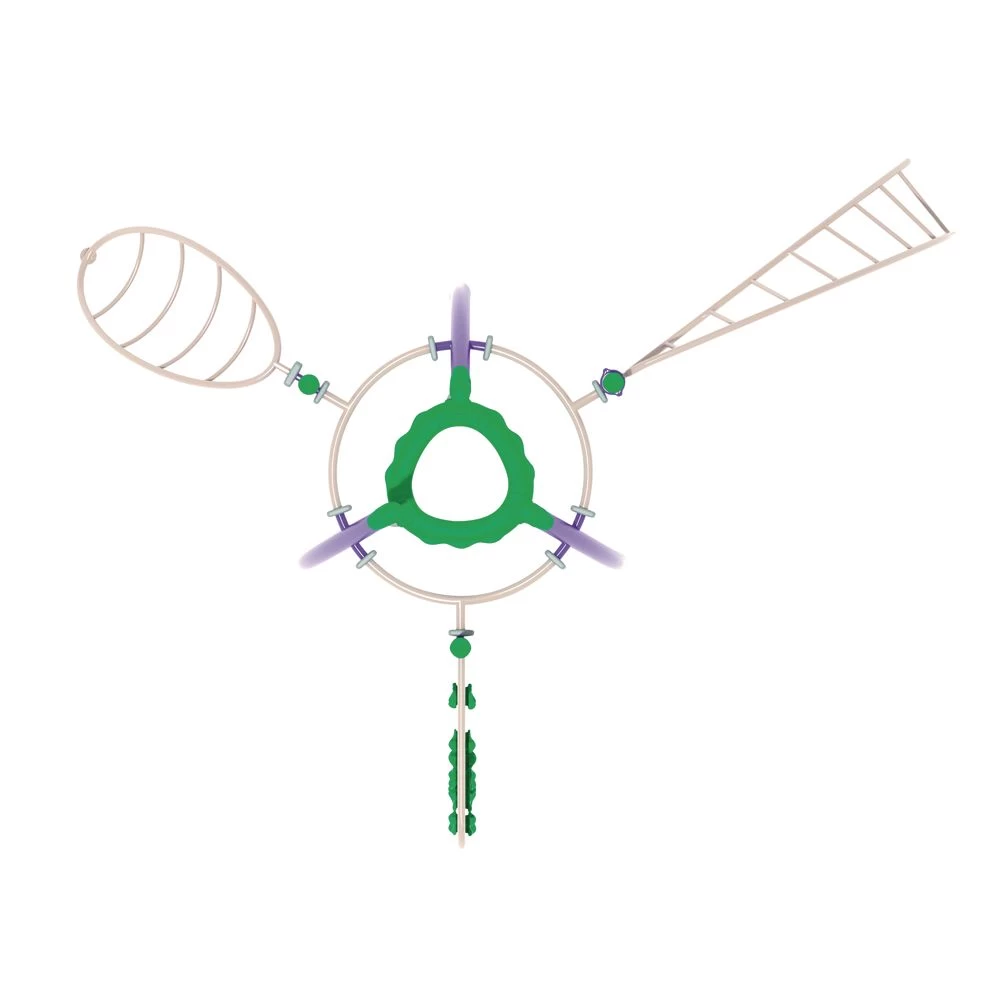 The Ophir Pass play structure is an all-in-one climbing station with four distinct climbers put together. The Vertical Horizon Climber has a rounded shape with curved bars, making it tricky to find the next step. The PE Rock Climber is a miniature rock wall, which challenges kids to climb up and sideways while holding on to its rotationally molded plastic hand grips. The Twisted Rung Climber starts out as an ordinary ladder but soon has children hanging on tight as they try to make it all the way to the last rung while climbing sideways. The highlight of the structure is the Tower of Rings in the middle, which ties it all together. It features three suspended rings which children can climb through the middle of, or along the outer edges. Children will find themselves seamlessly climbing in every direction, from one structure to the next, as they maneuver around the Ophir Pass. Meets national standards for ASTM F1487-17 and CPSC Guidelines #325. Fall height 96”. ADA Compliant