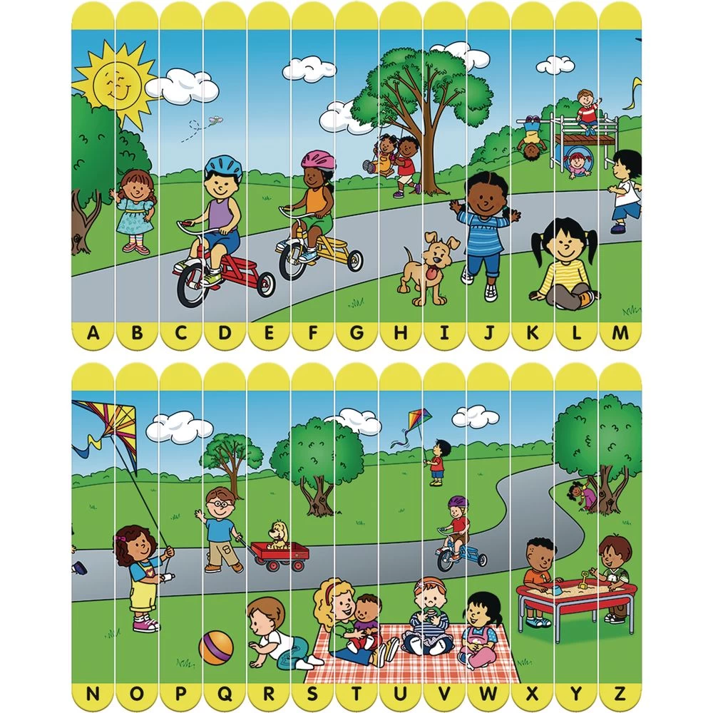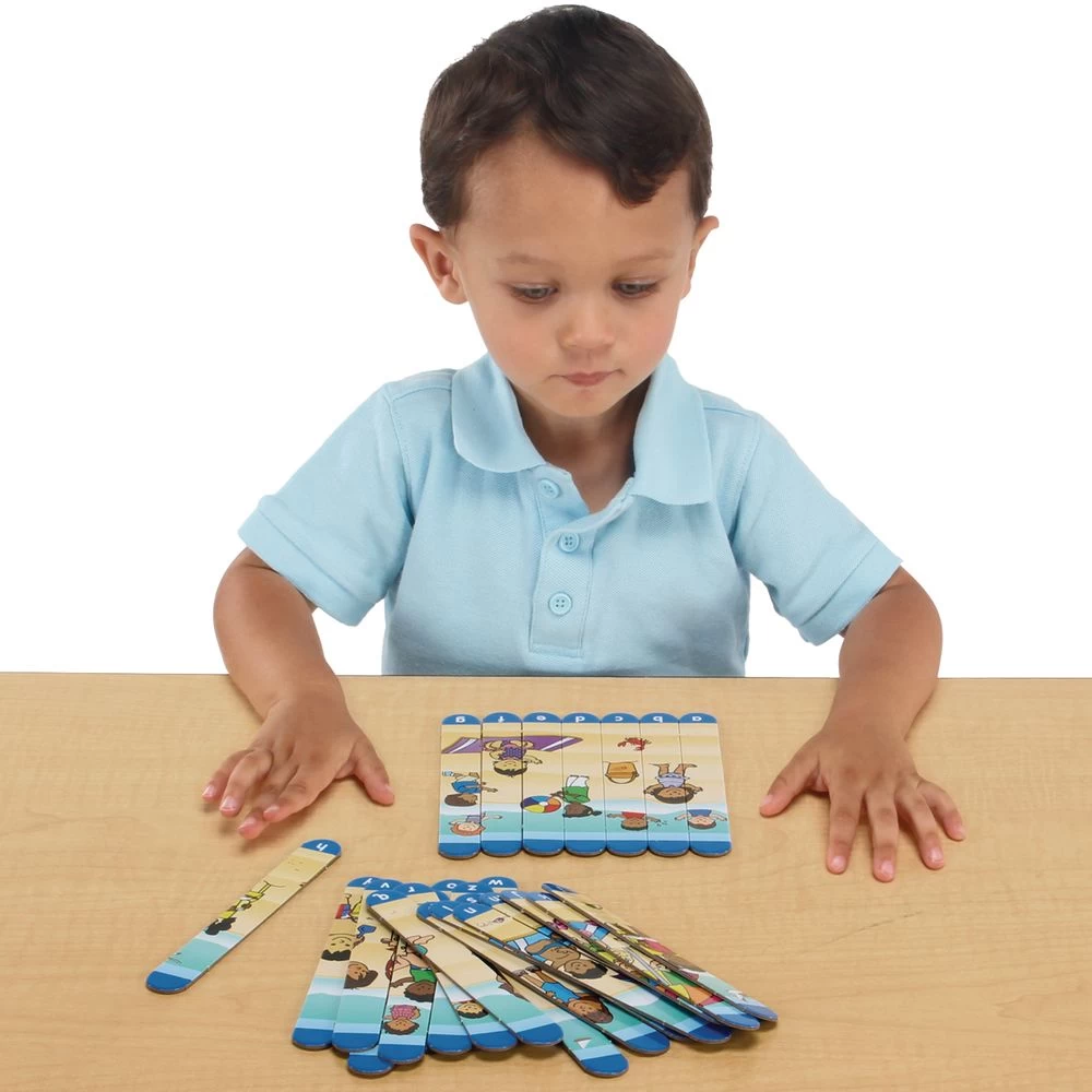 Little ones will love learning their ABCs with these two adorable puzzles. They place the letter sticks in alphabetical order; when the puzzle is finished, it will reveal an appealing scene that allows students to self-check their work. Includes one set of uppercase letters and one set of lowercase.