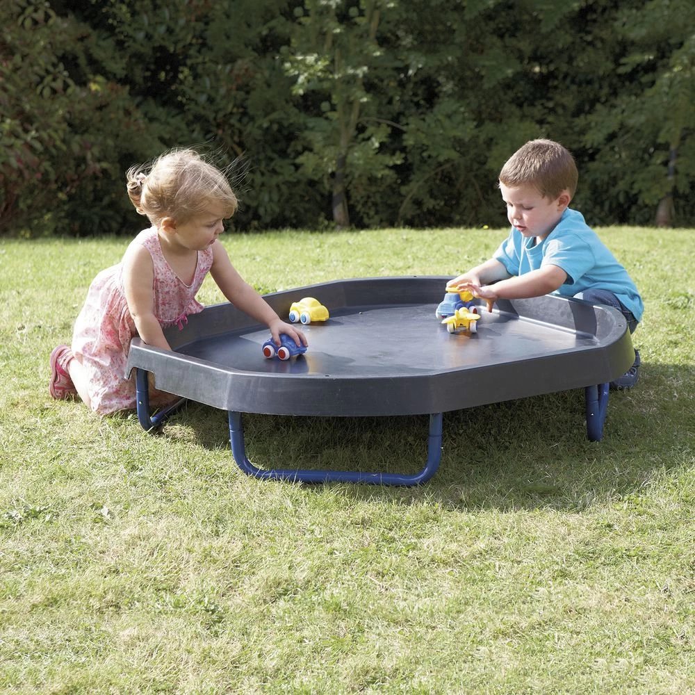 This versatile tray has so many uses! Will you set up a jungle with real plant cuttings and animals, or will you create some super outdoor art using messy materials? You can easily carry them, attach canopies to the top holes, and easy to store. Why not fill it up with sand and hunt for squidgy sparkle letters, fill it with water and sail a boat you made yourself, or use it as a giant inspection tray for minibeasts? The possibilities are endless! Eight sided to encourage group play. Made from extremely durable recycled plastic. The tray has a diameter of 37 inches and a depth of 2.4 inches. Colors may vary.