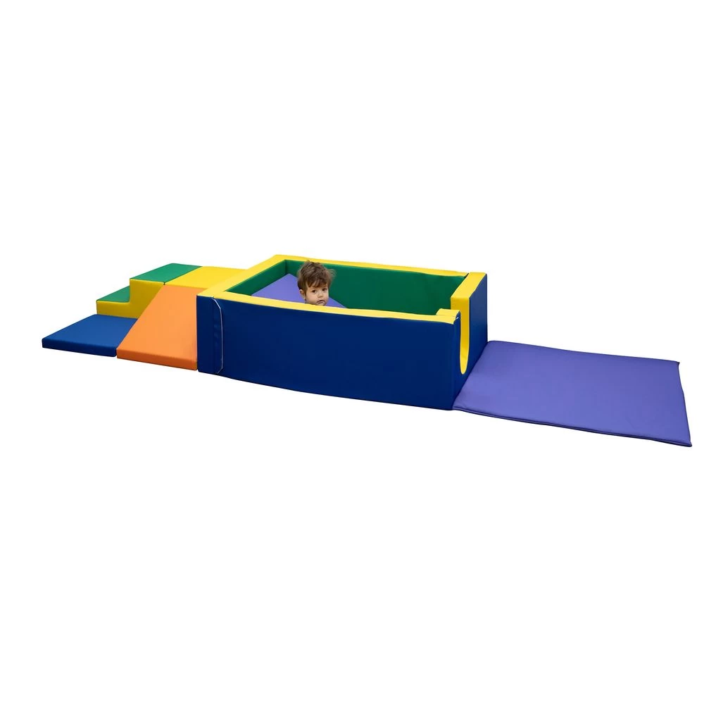 - MULTIPLE CONFIGURATIONS: Adventure Center includes 3 soft sections: Climber, Play Yard and Mat. All pieces attach together with hook and loop fasteners.