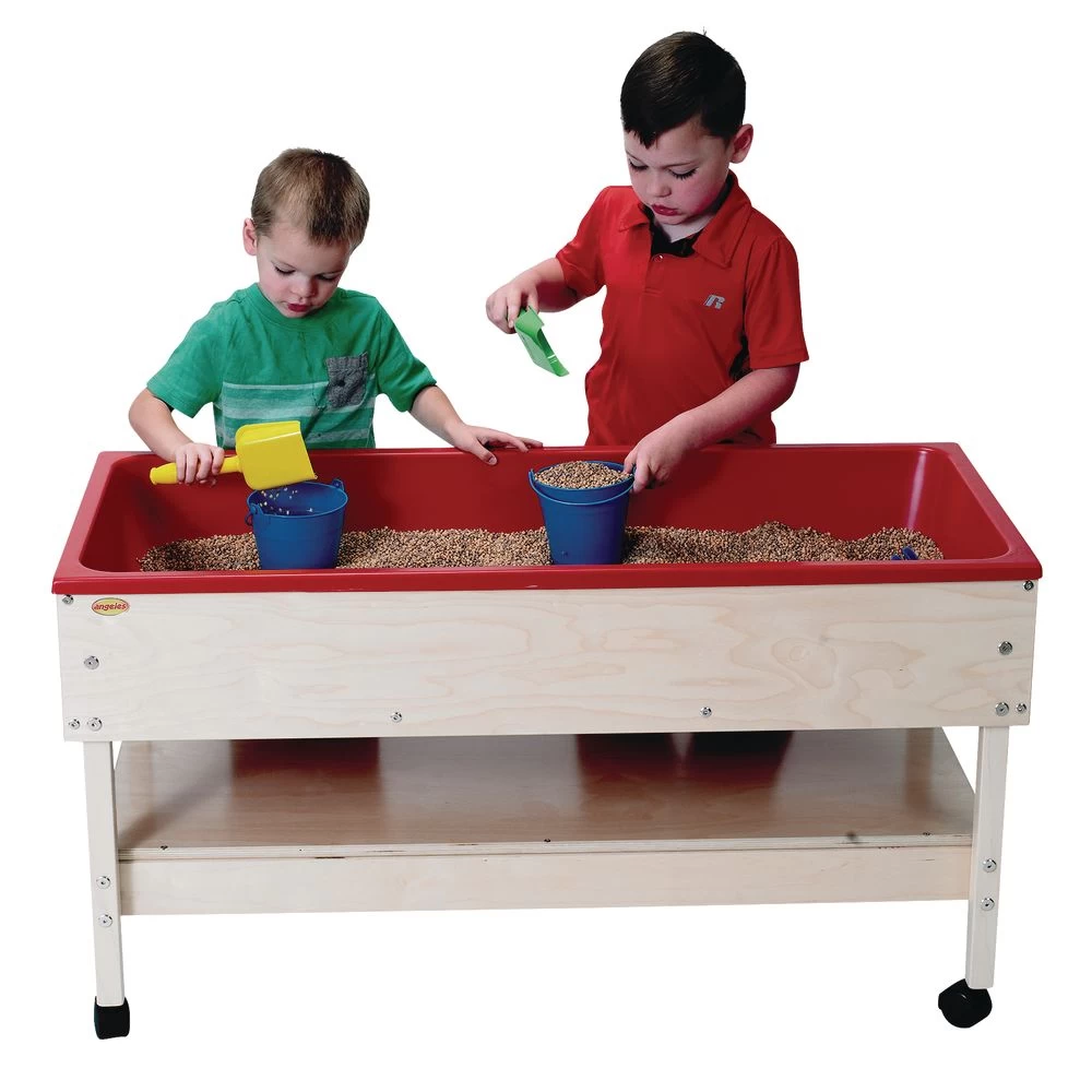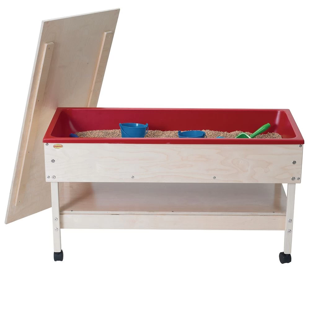 Fill this solid maple table with water, sand or sensory materials and provide children with a relaxing and stress-reducing sensory experience. The tub is made of sturdy weather-proof plastic. A shelf for storage. Great for indoor and outdoor use. Has four casters for easy movement and locking capability for stability. Table measures 45 inches long x 20 inches wide x 24 inches high. Lid measures 45inches long x 20inches wide.